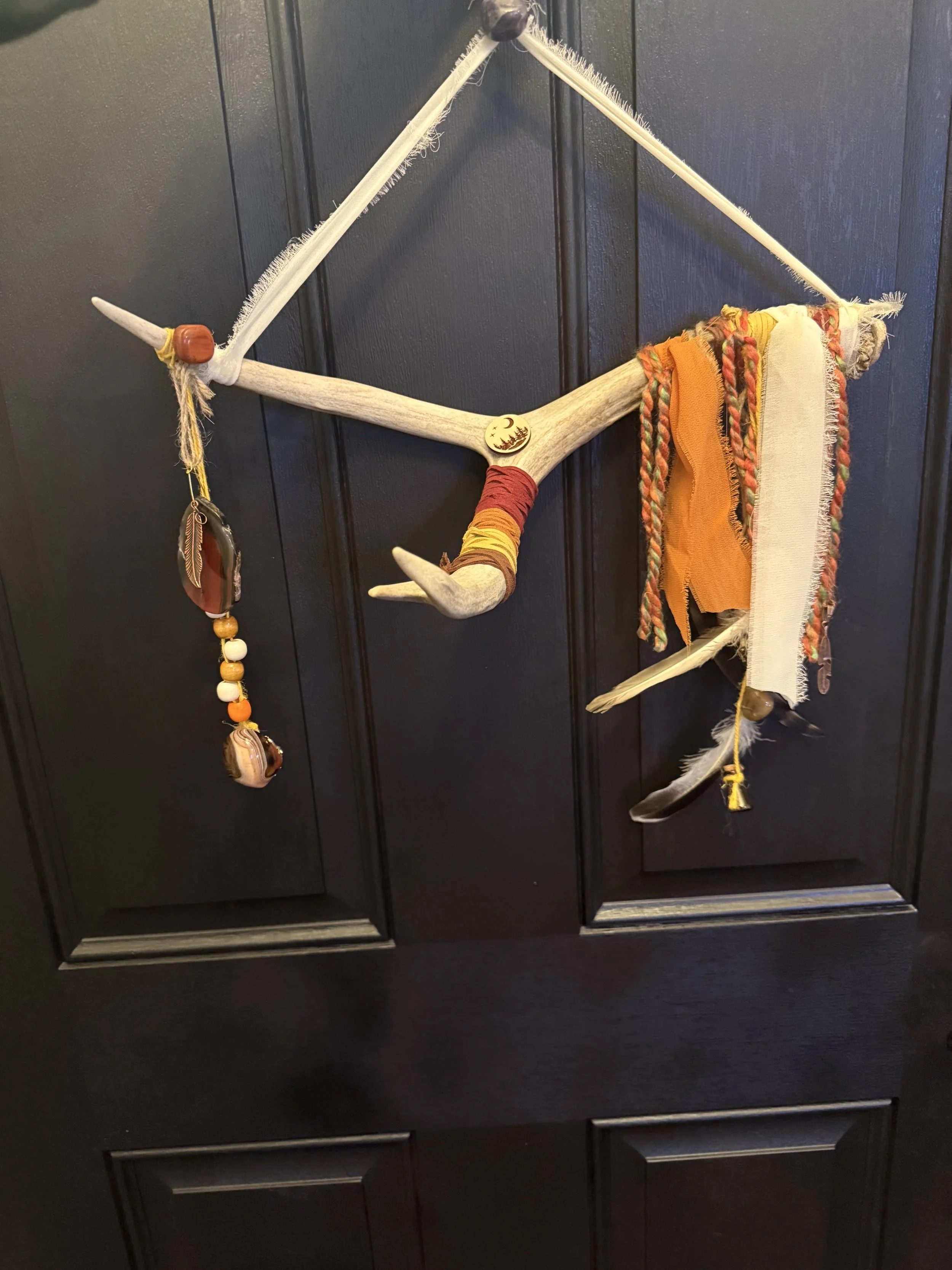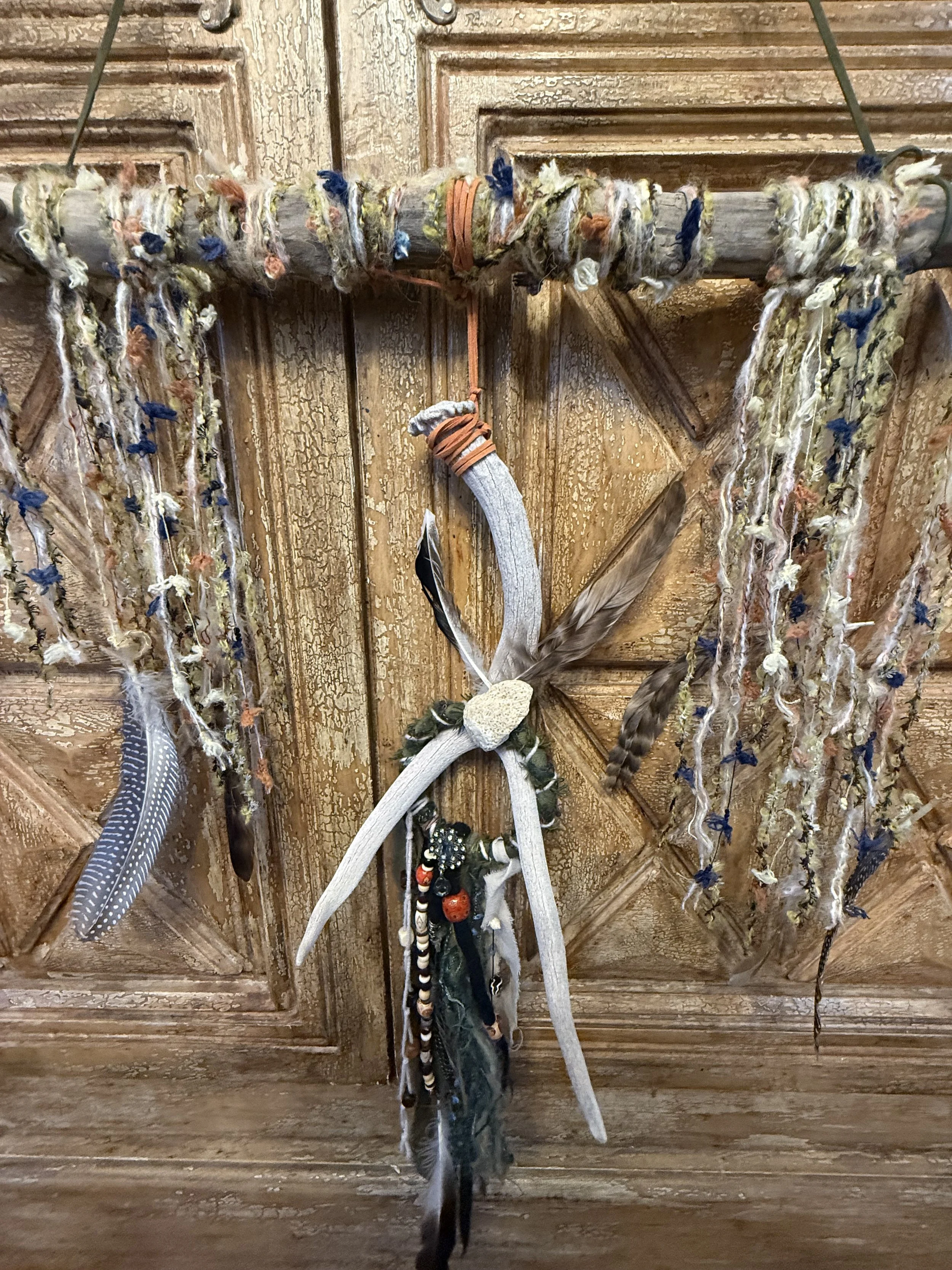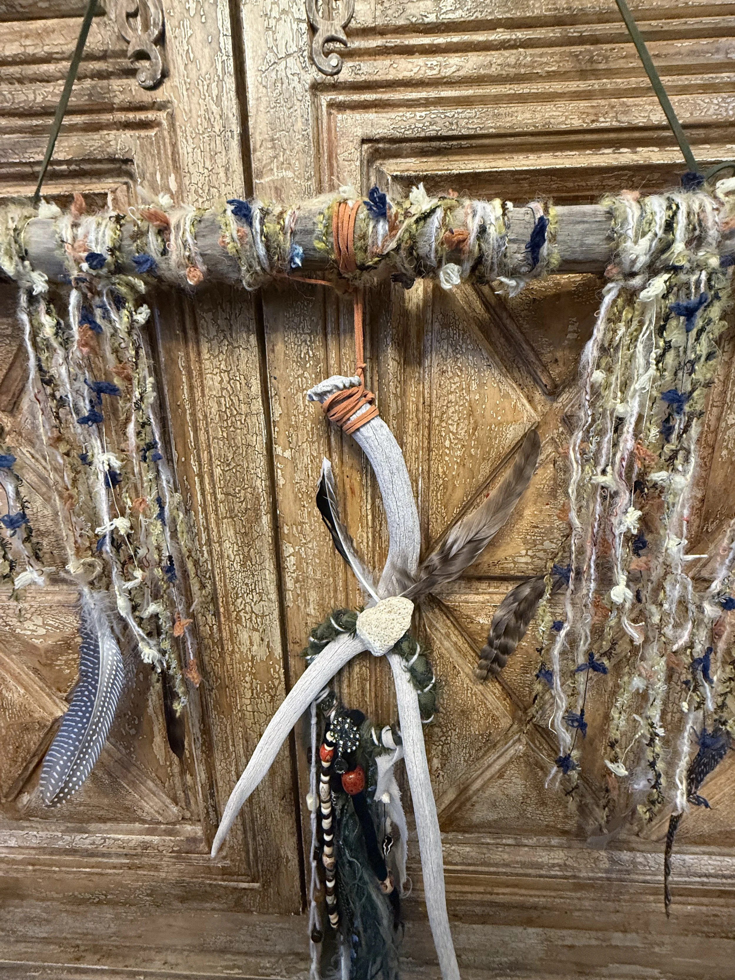 Materials: Naturally shed antler • Stone • Feathers • Textured yarn • Wooden beads
