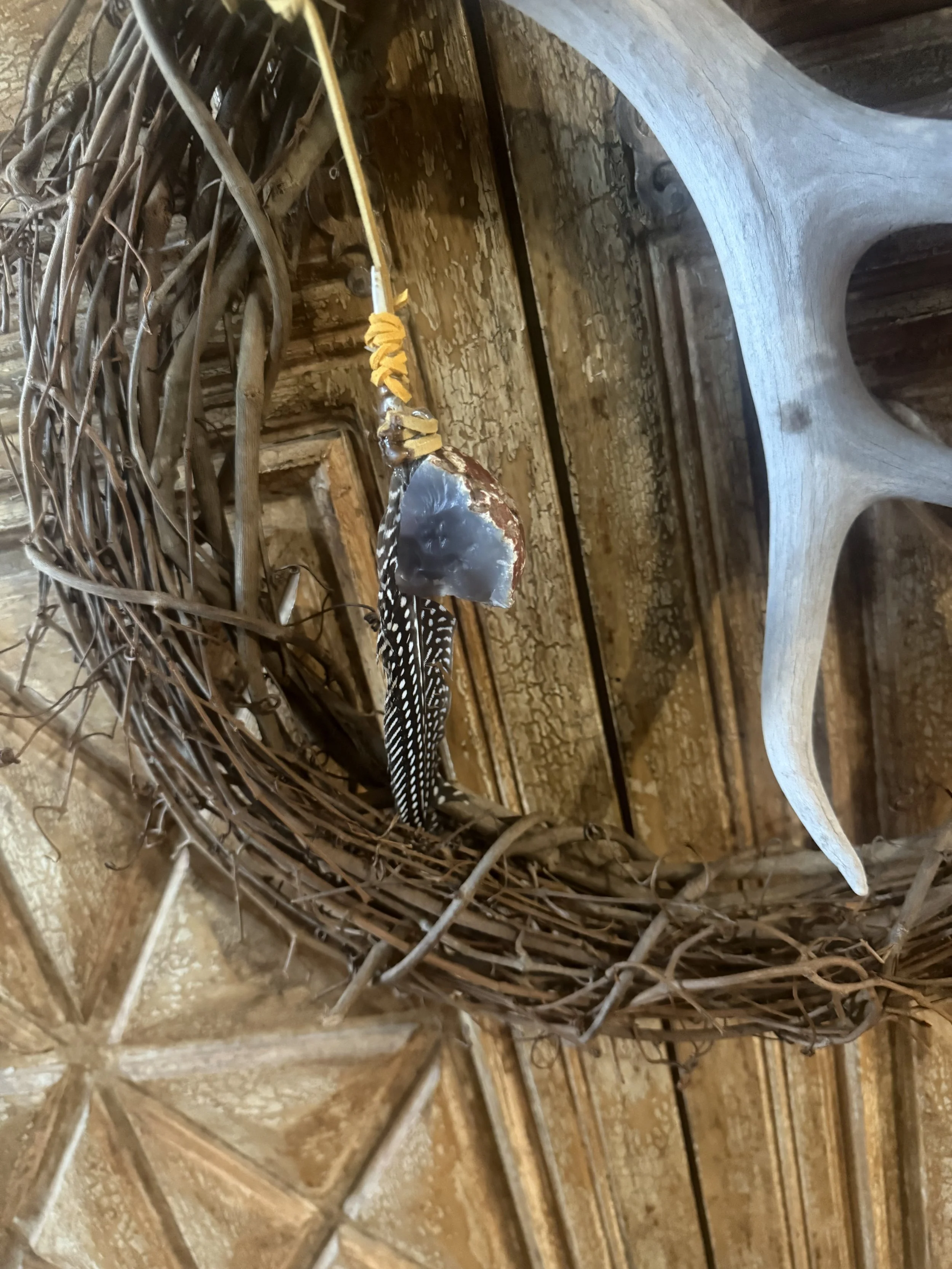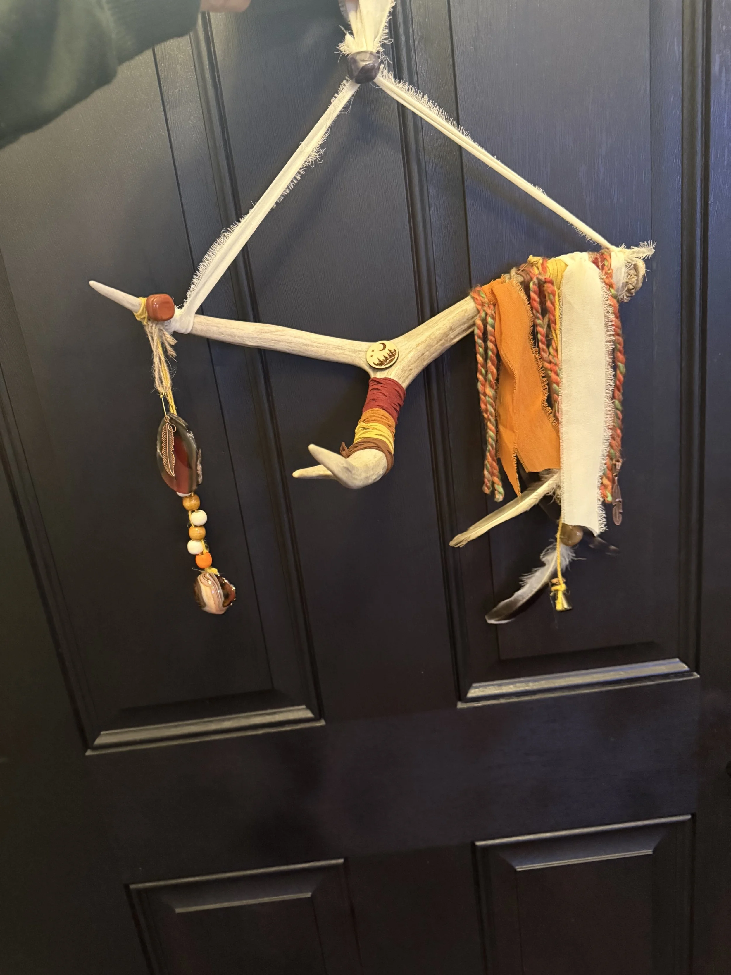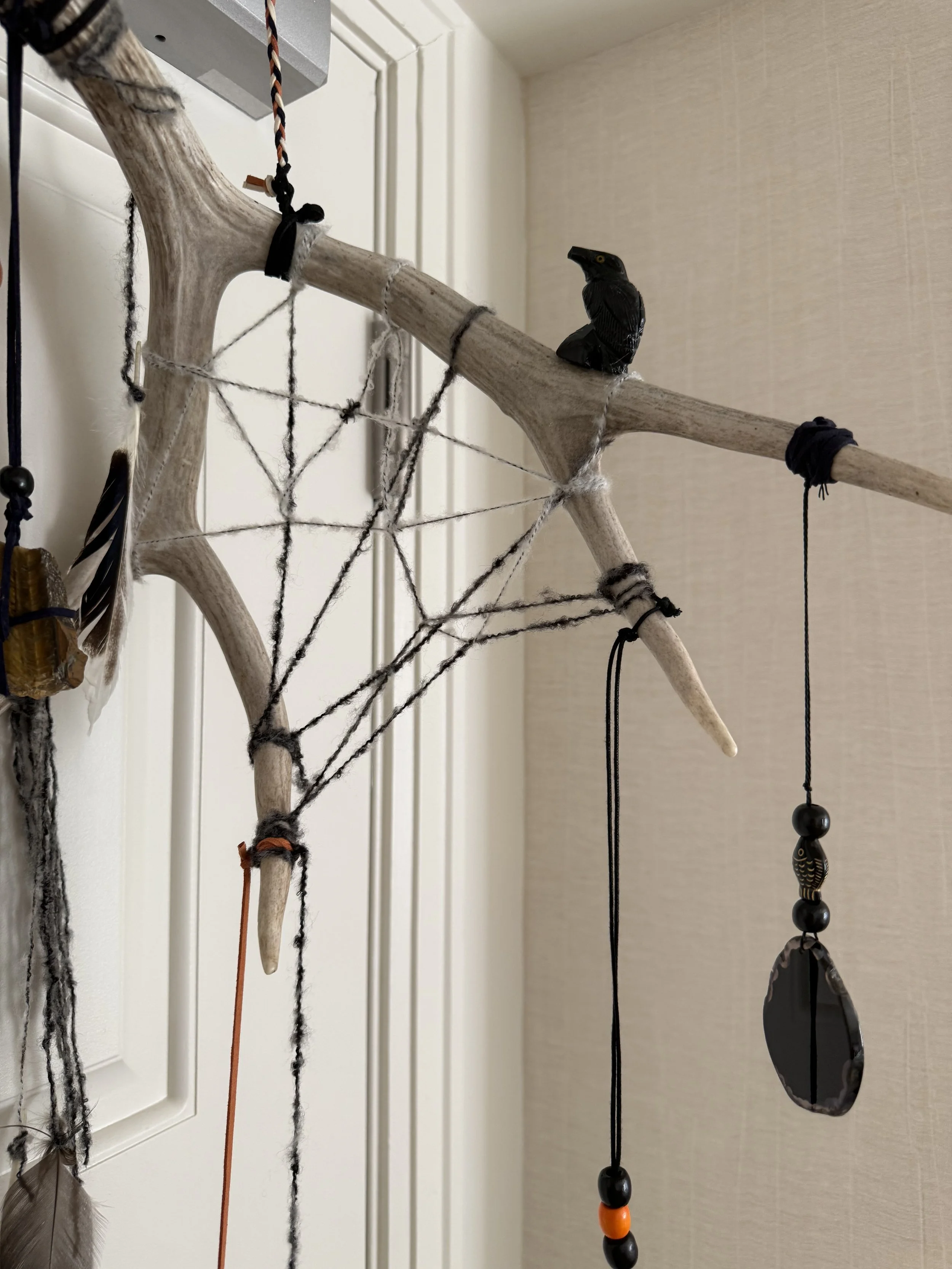 Materials: Naturally shed antler • Stone • Feathers • Textured yarn • Wooden beads