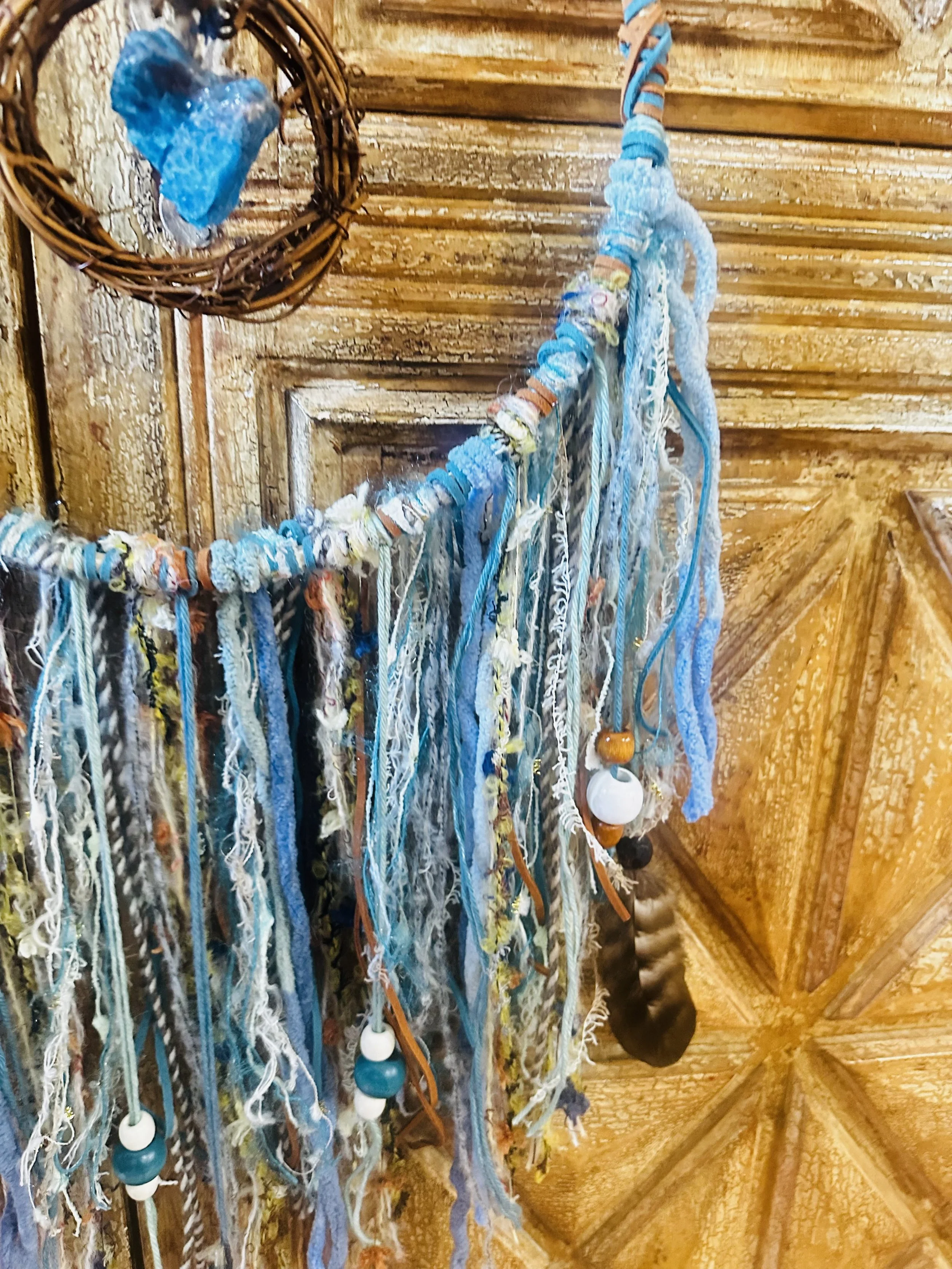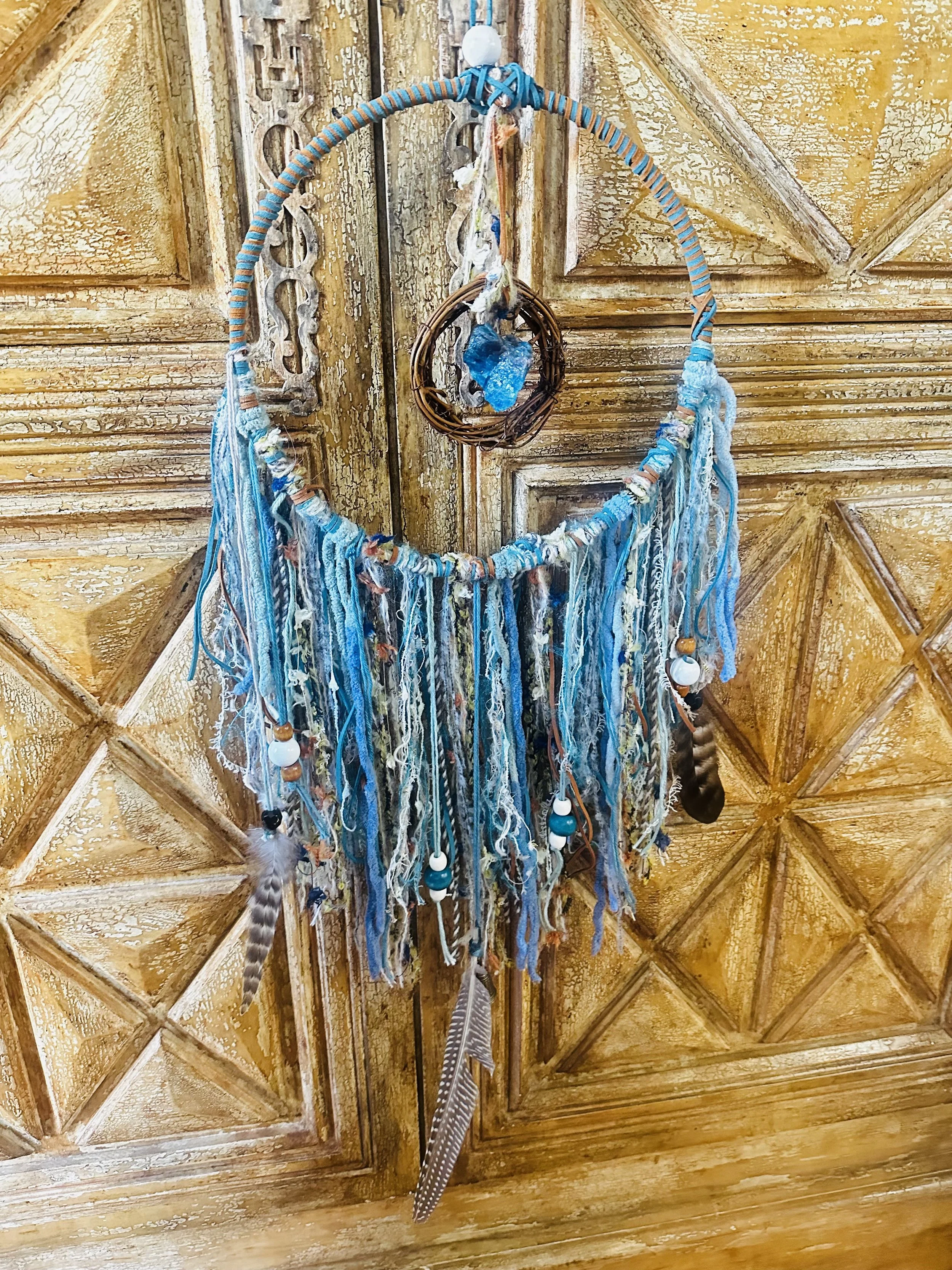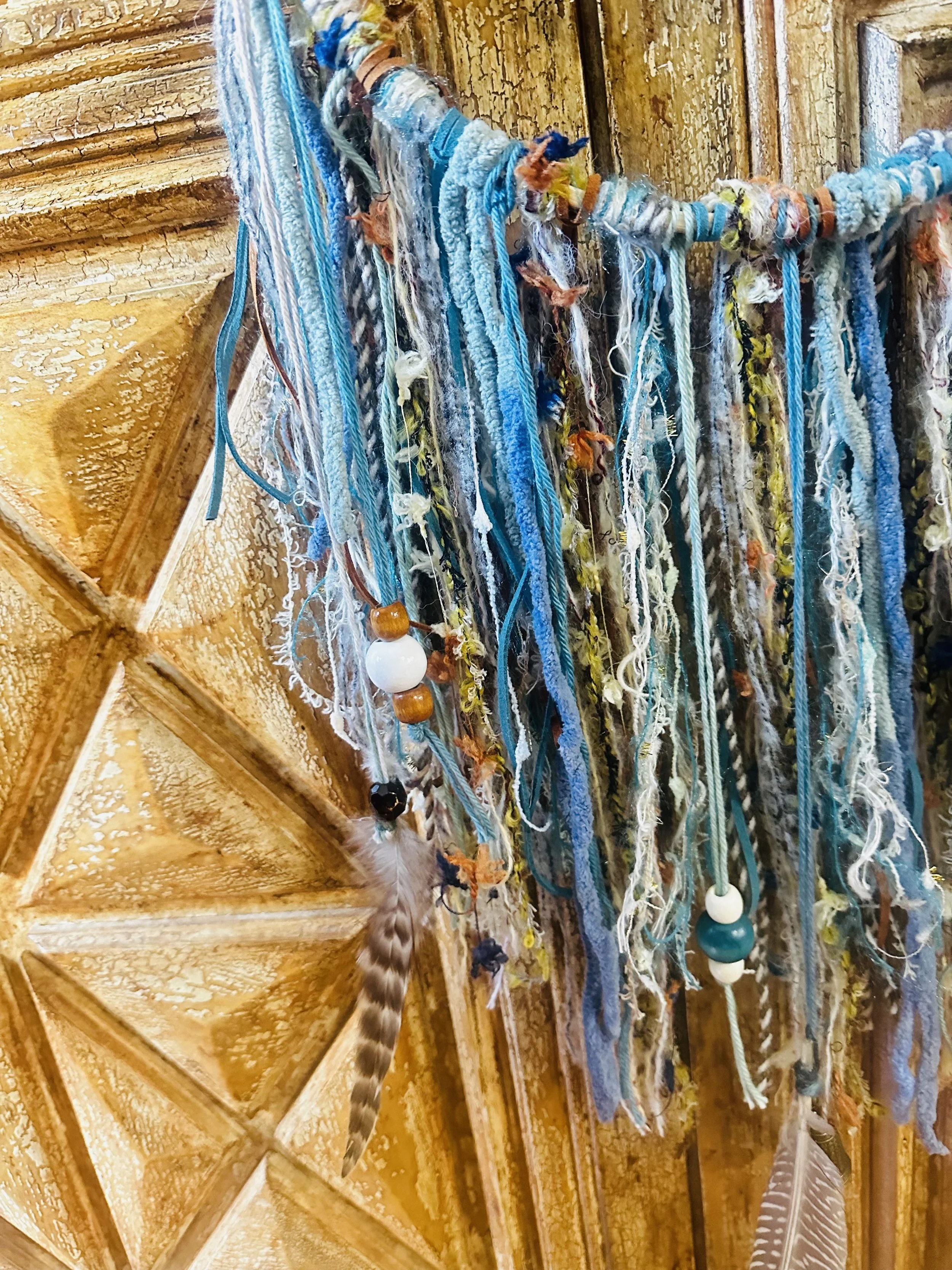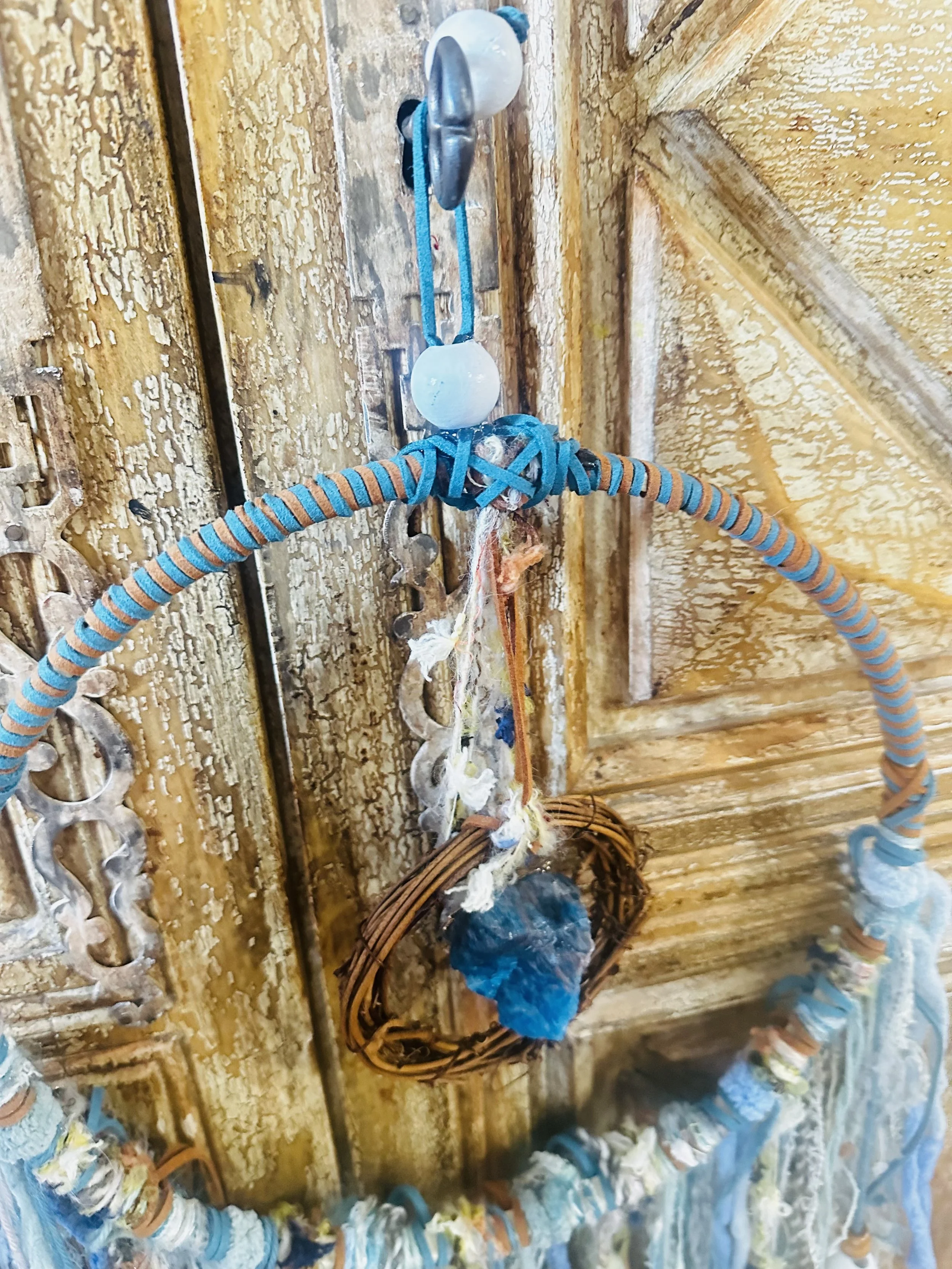 Born of the tide and wind, ocean whisperer channels the energy of water, cleansing, expressive and deeply intuitive. It carries a voice of serenity, reminding you to flow rather than fight. Layers of sea blue fiber, driftwood hues & crystal light, handwoven for calm, communication and flow