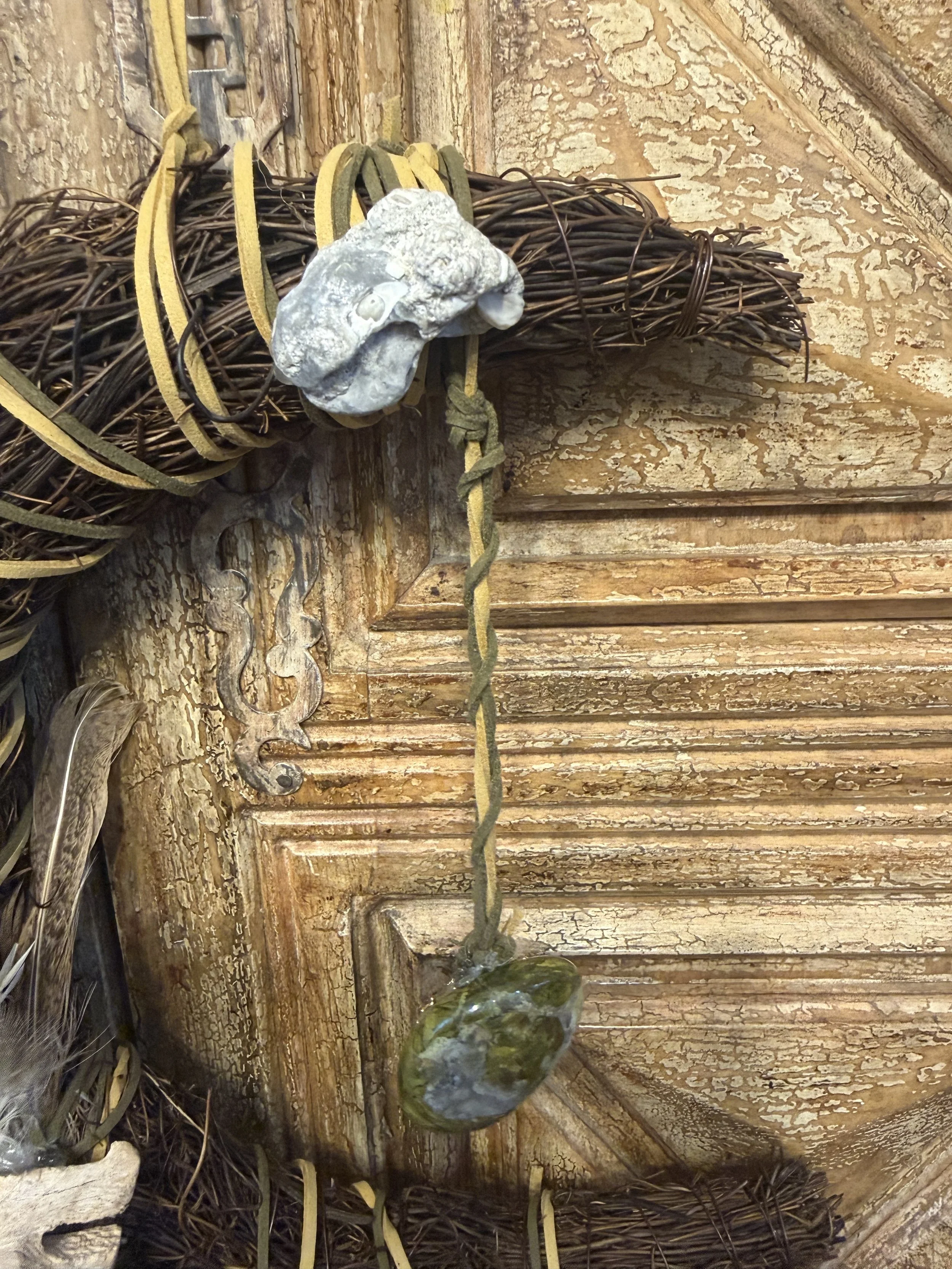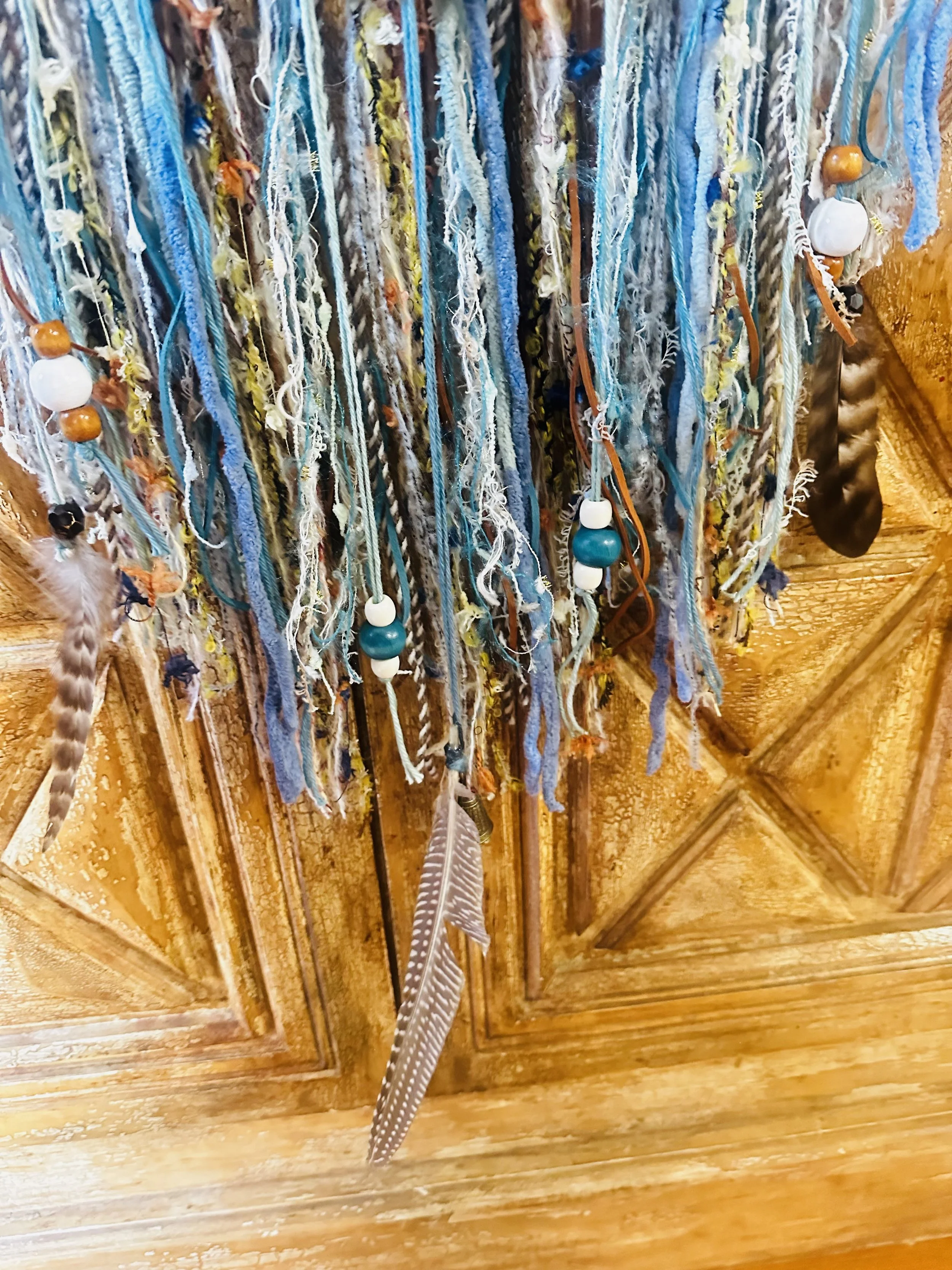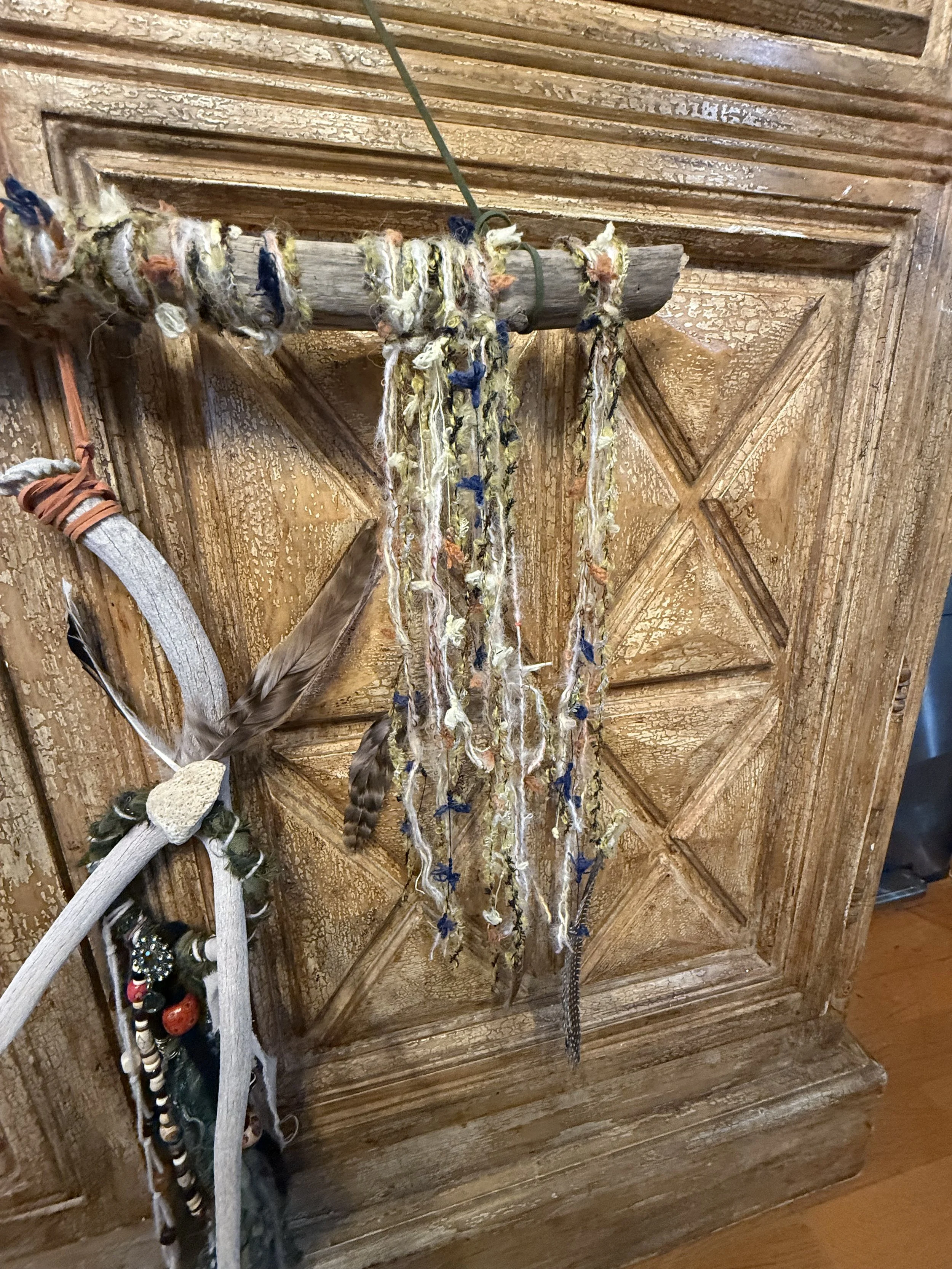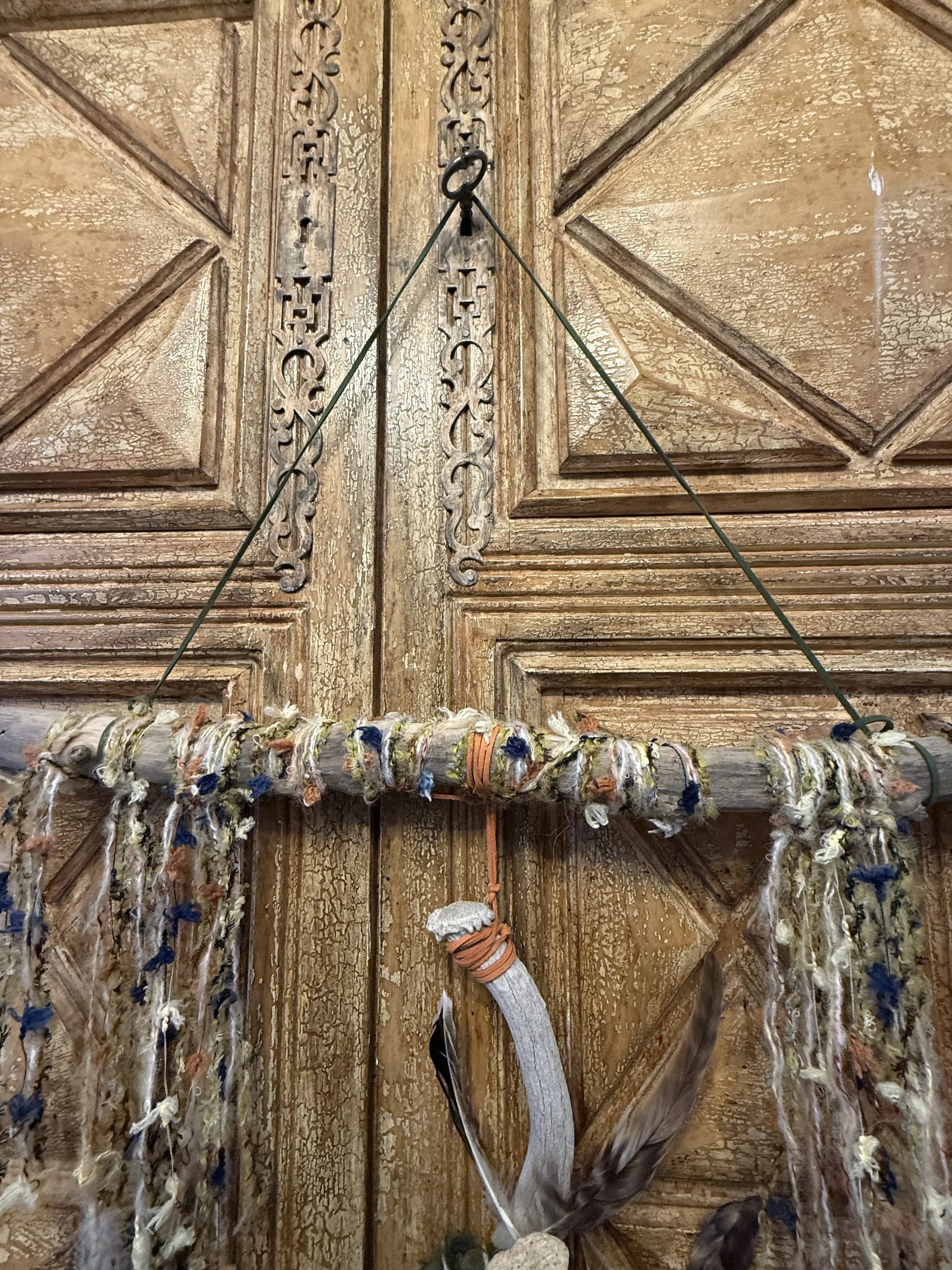 The wrapped driftwood holds the wild textures of the forest. Antler, feather, wool and vine. It hums with the energy of the old world where every branch, stone and sound belonged to something greater. Hang it near your front entryway as a reminder to walk gently, listen deeply and honor what came before you