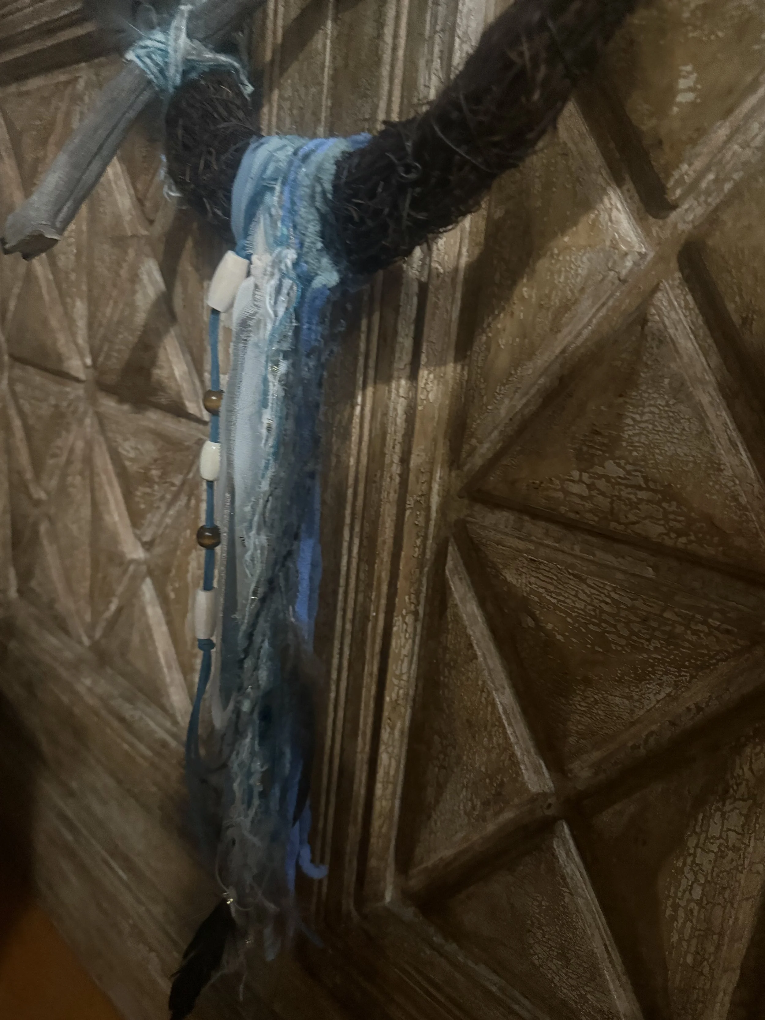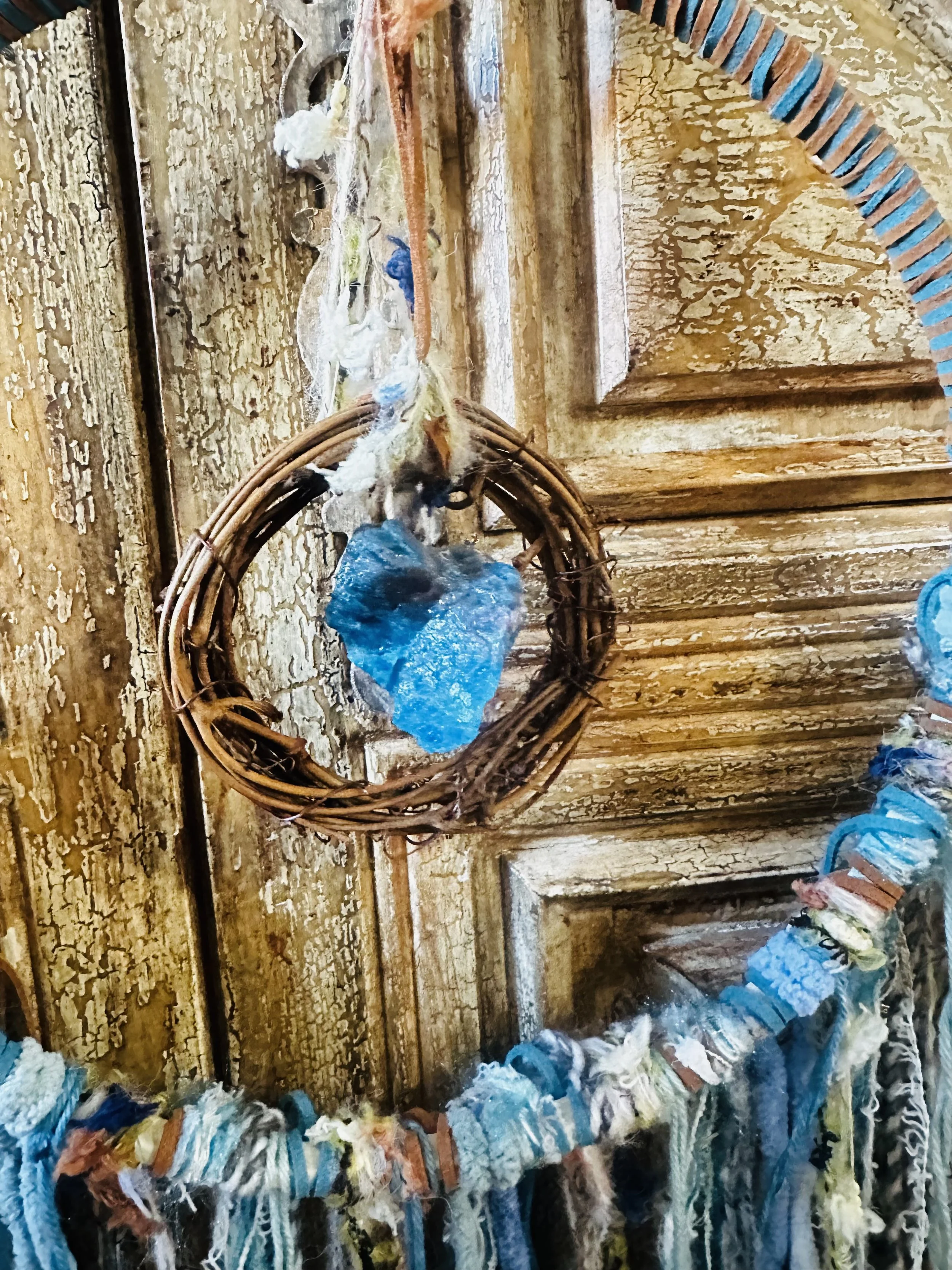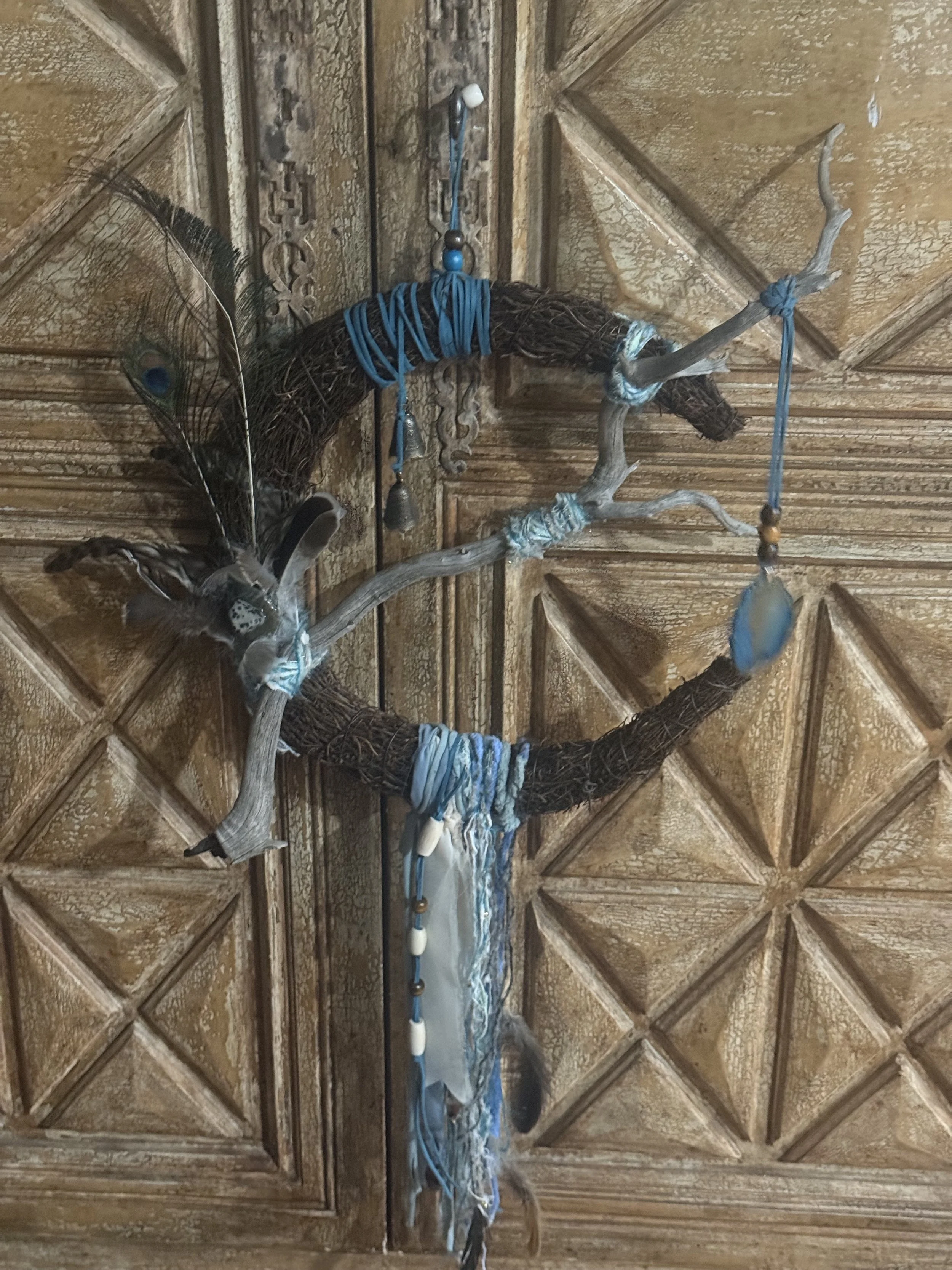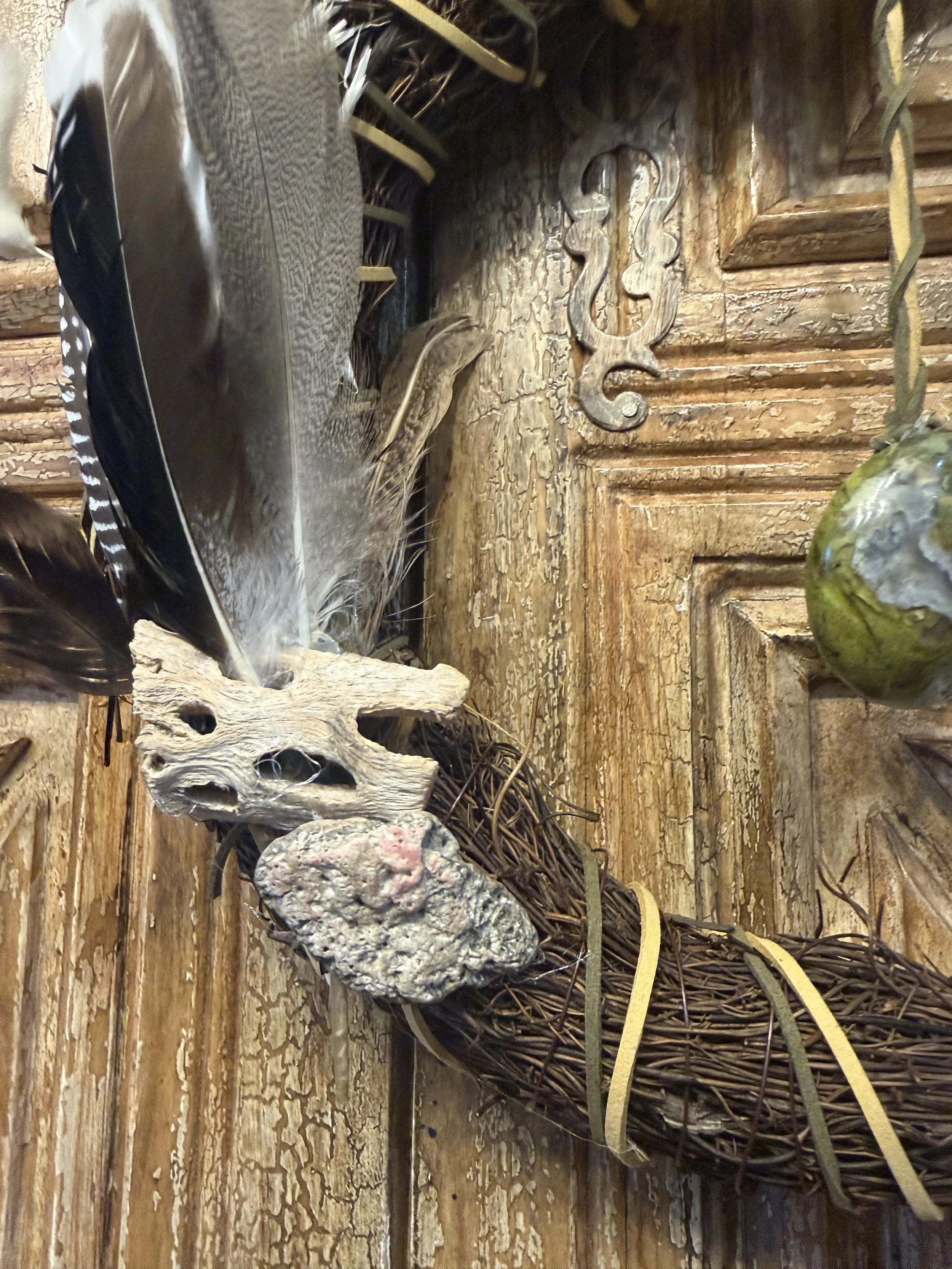The wrapped driftwood holds the wild textures of the forest. Antler, feather, wool and vine. It hums with the energy of the old world where every branch, stone and sound belonged to something greater. Hang it near your front entryway as a reminder to walk gently, listen deeply and honor what came before you