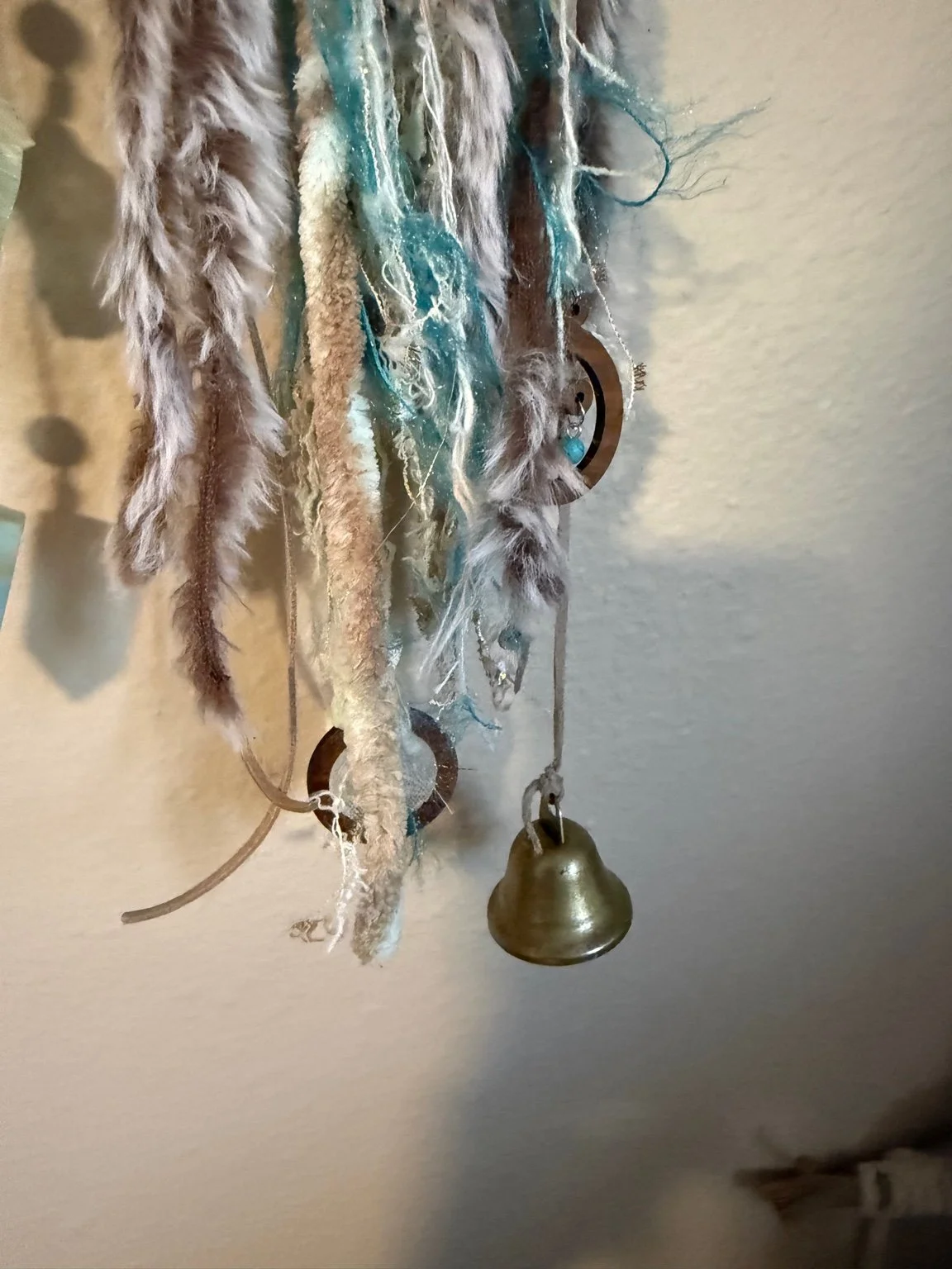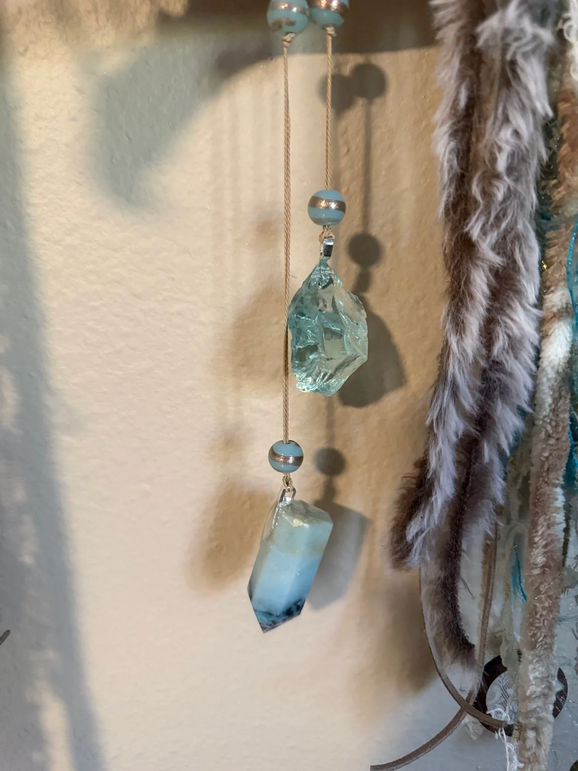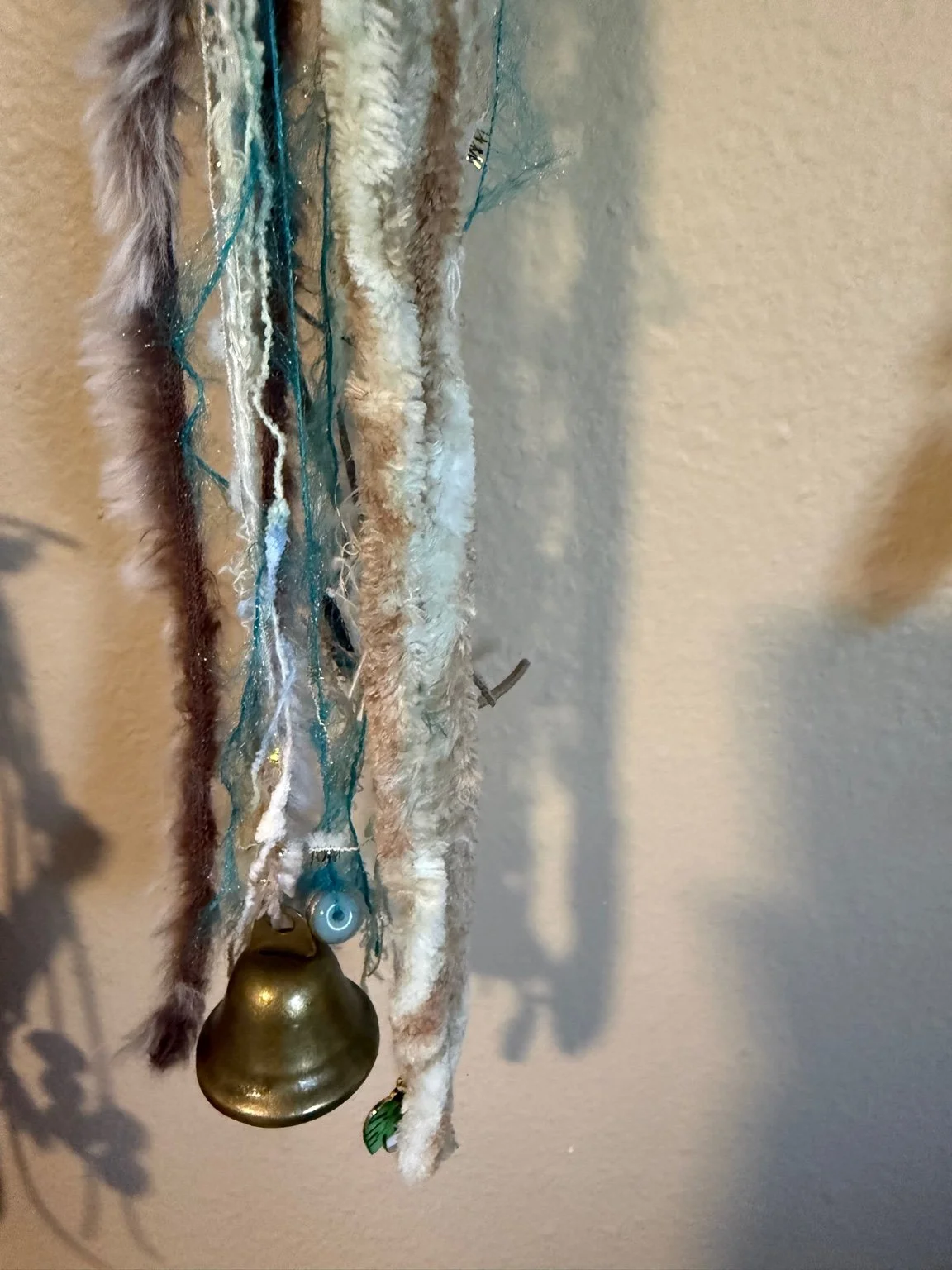 Driftkeeper holds the gentle magic of sea-washed dreams — faux fur, ocean blues, bells and crystals woven into a talisman for clarity, softness, and peace.