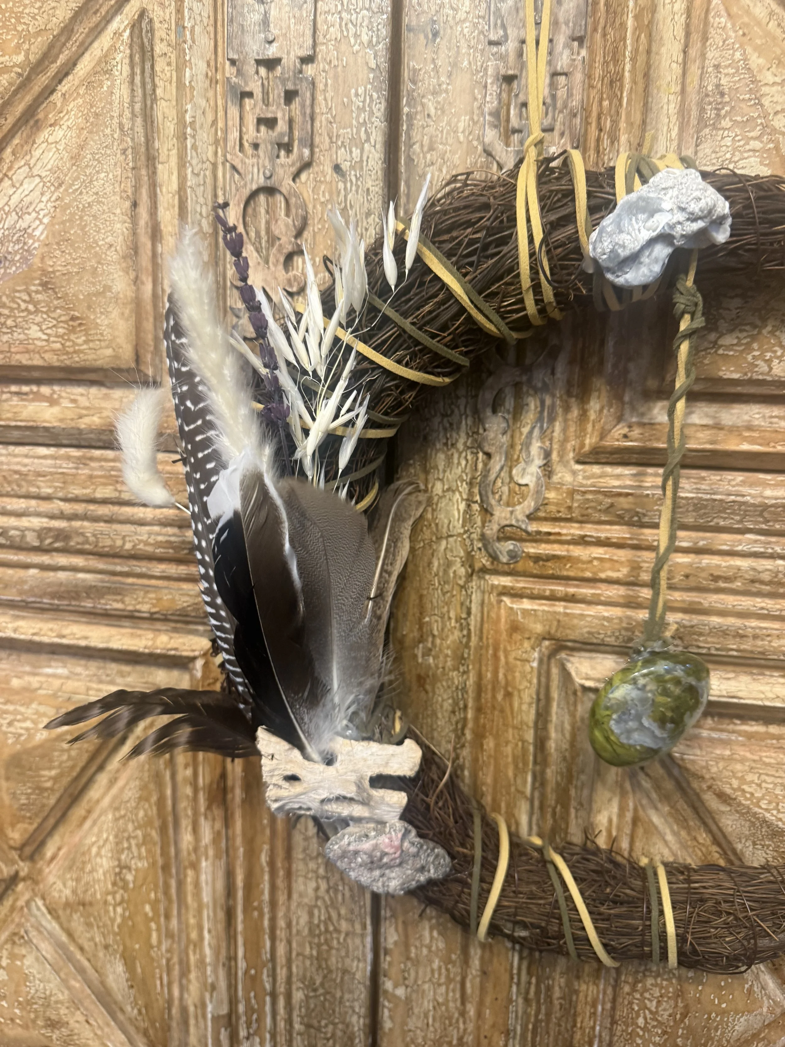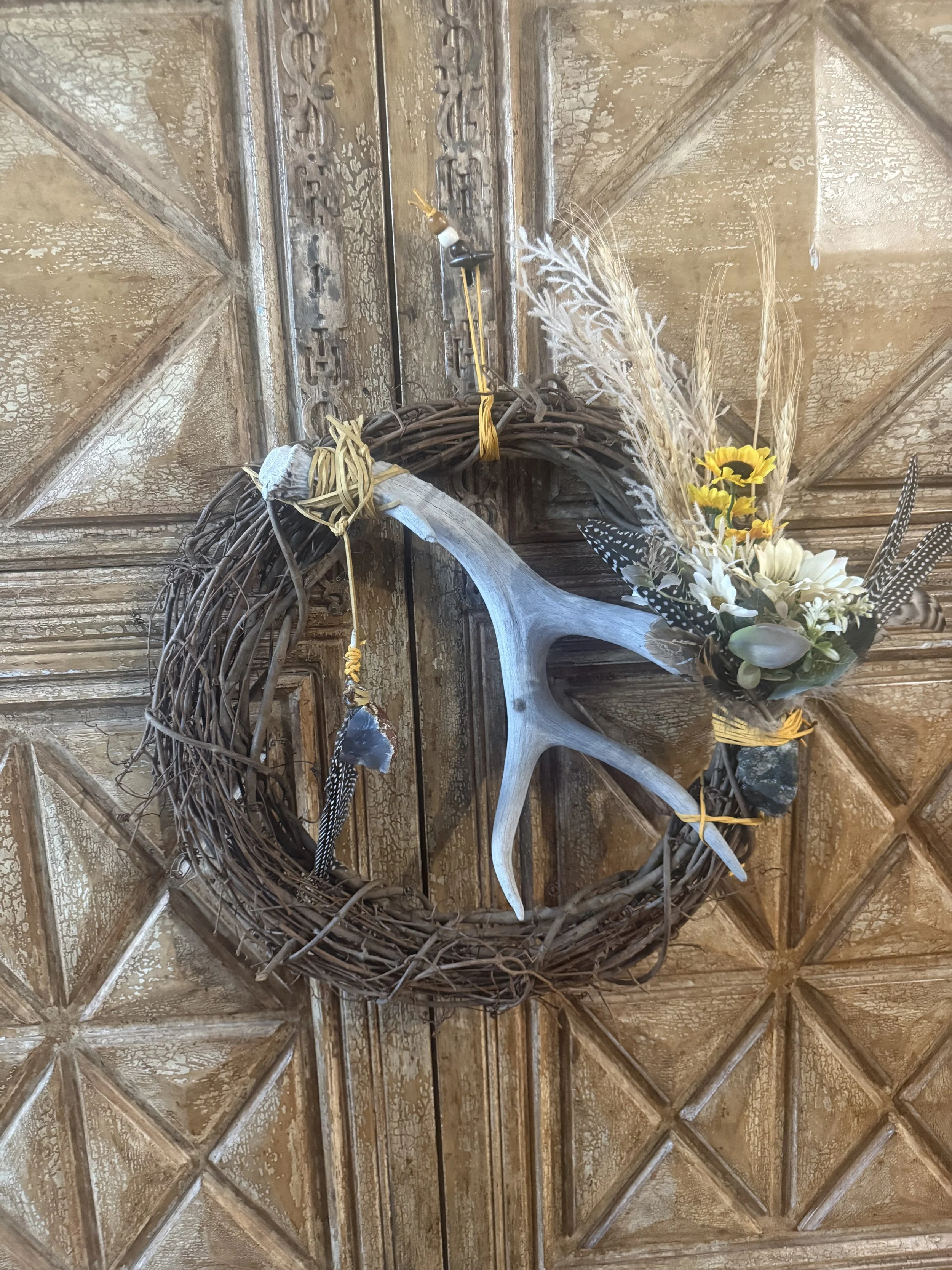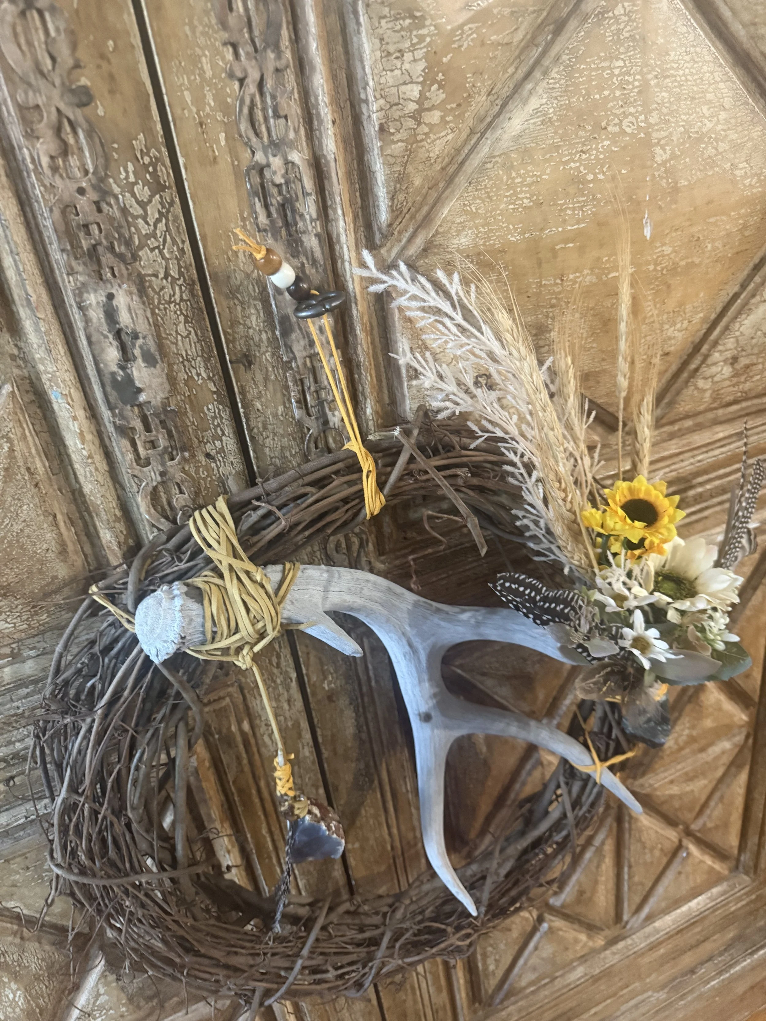 Antler, vine, wheat and stones, woven for grounding, gratitude and strength