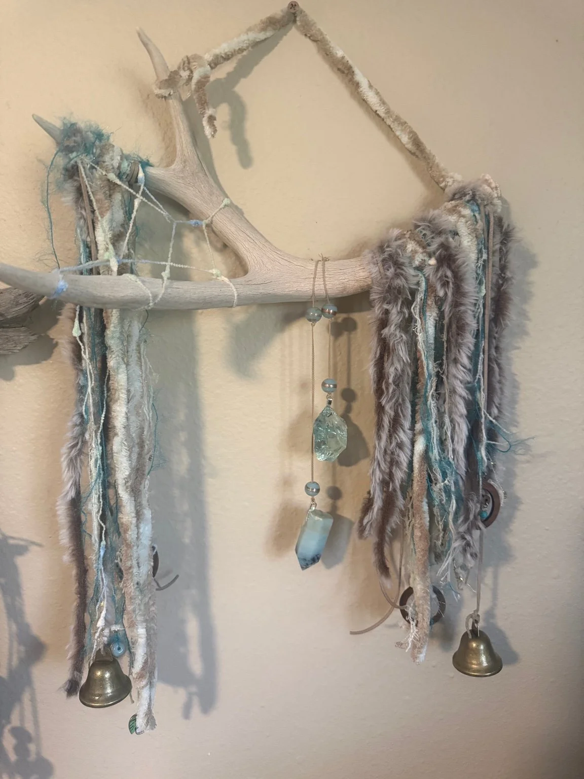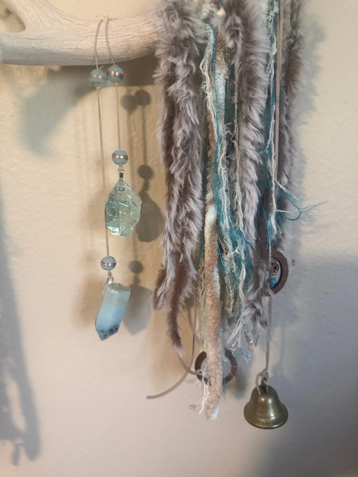 Born of tide, mist, and moonlight, this talisman carries the calm of drifting water and soft winter air. Pale antler, icy-blue crystal, textured yarn, and gentle bells weave together to hold space for clarity, intuition, and emotional ease.