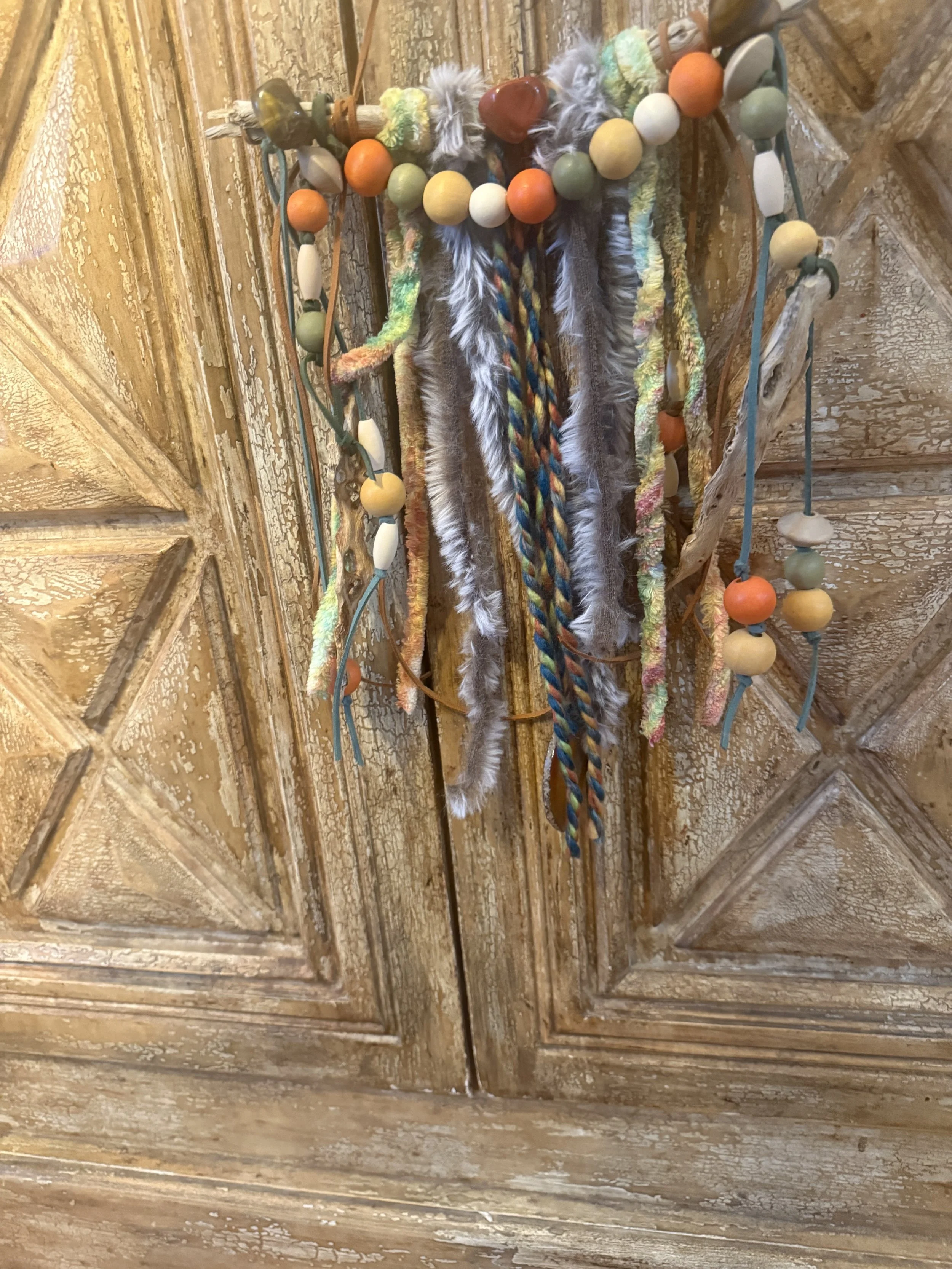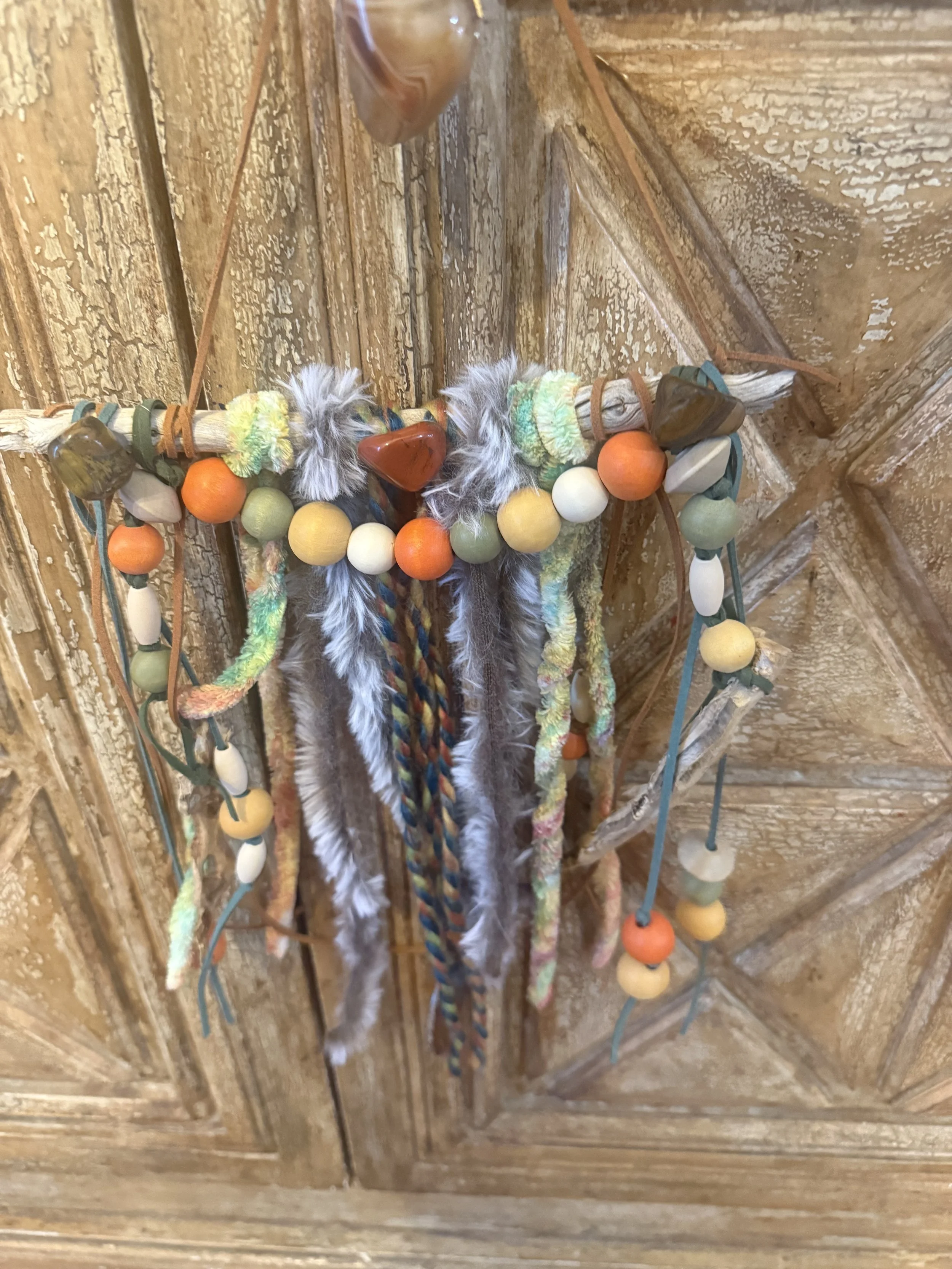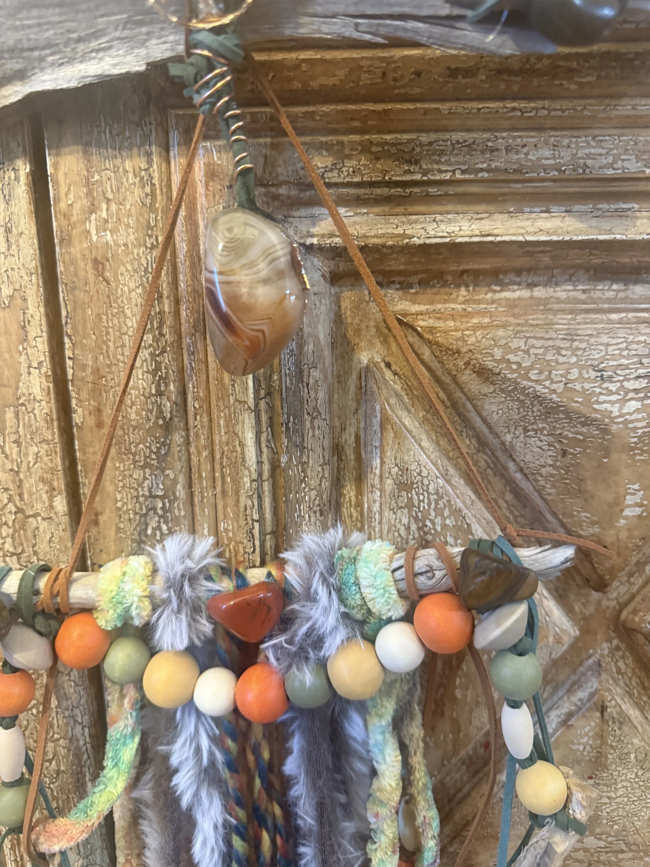 This talisman is crafted to call in playfulness, creativity, and emotional renewal. The driftwood acts as an ancient storyteller, grounding the piece in wisdom, while the agate amplifies clarity and uplifts the heart. Beads, feathers, and soft fibers weave together like a colorful prayer for joy.