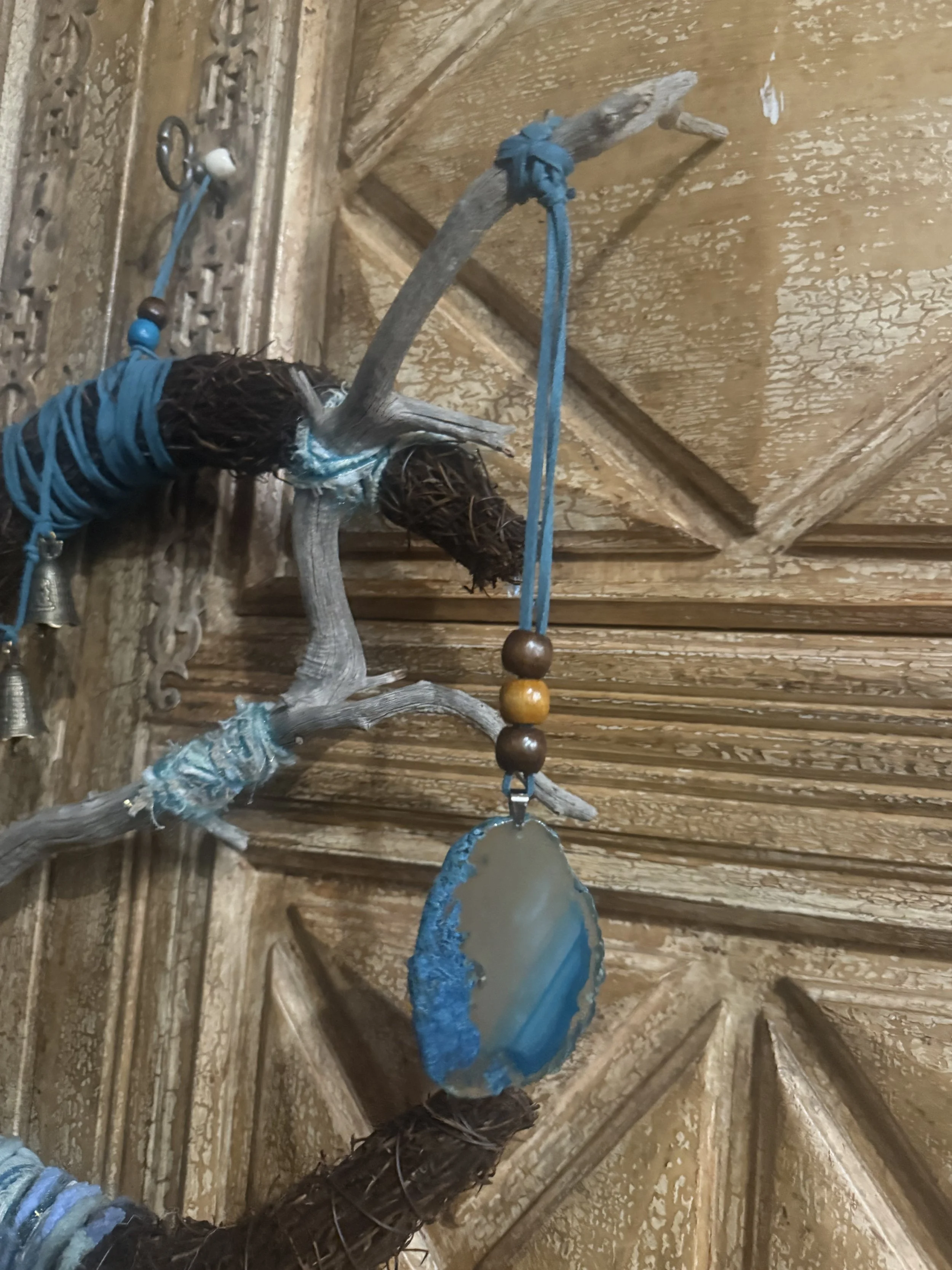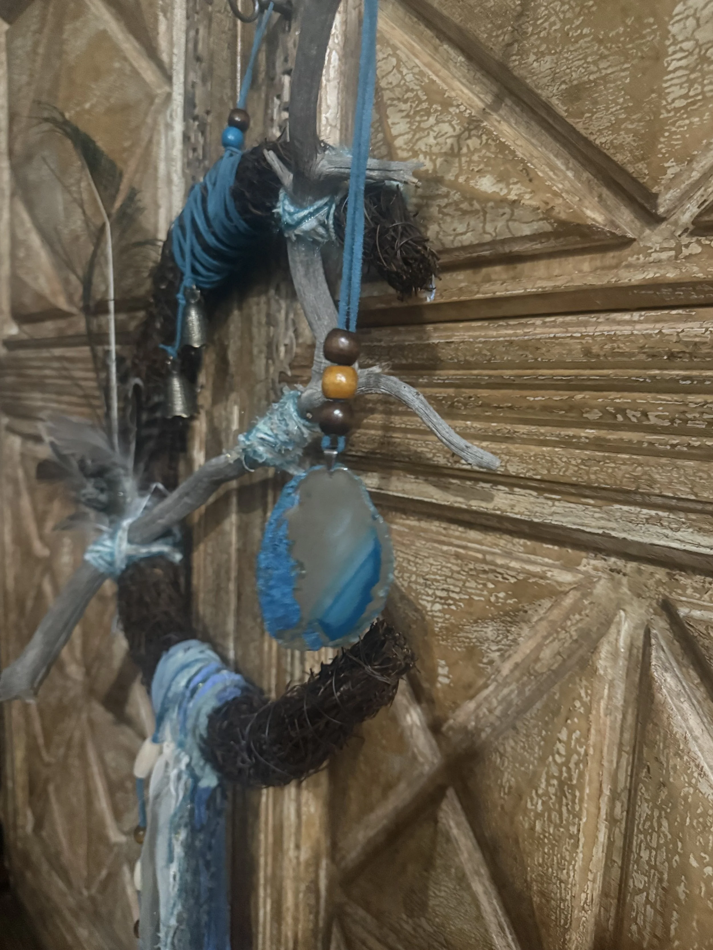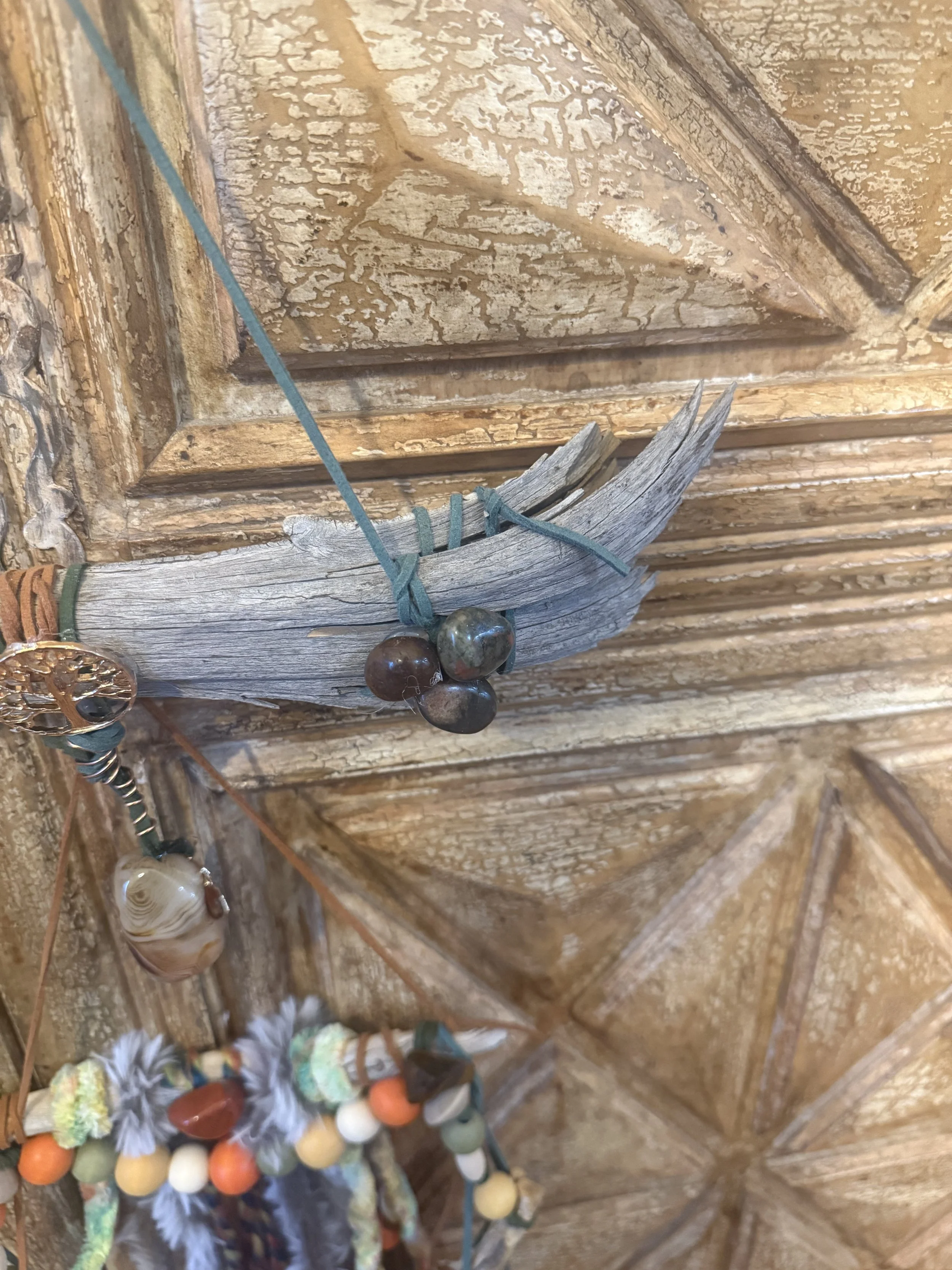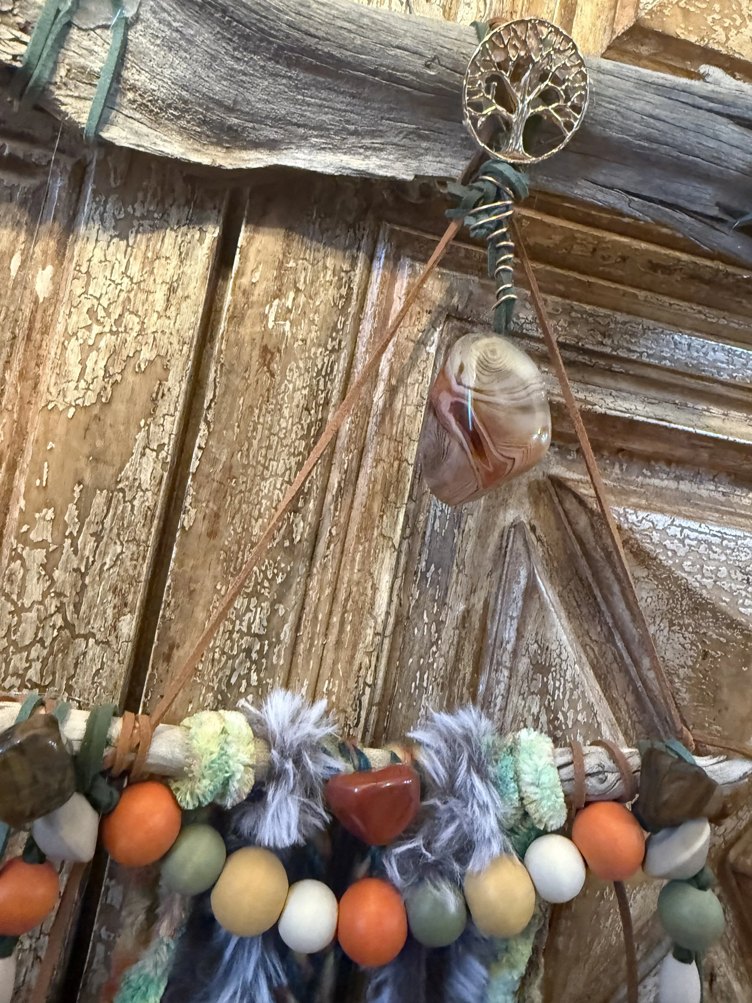 Driftwood, agate, feather and chime, crafted for clarity, intuition and the courage to move with the wind.