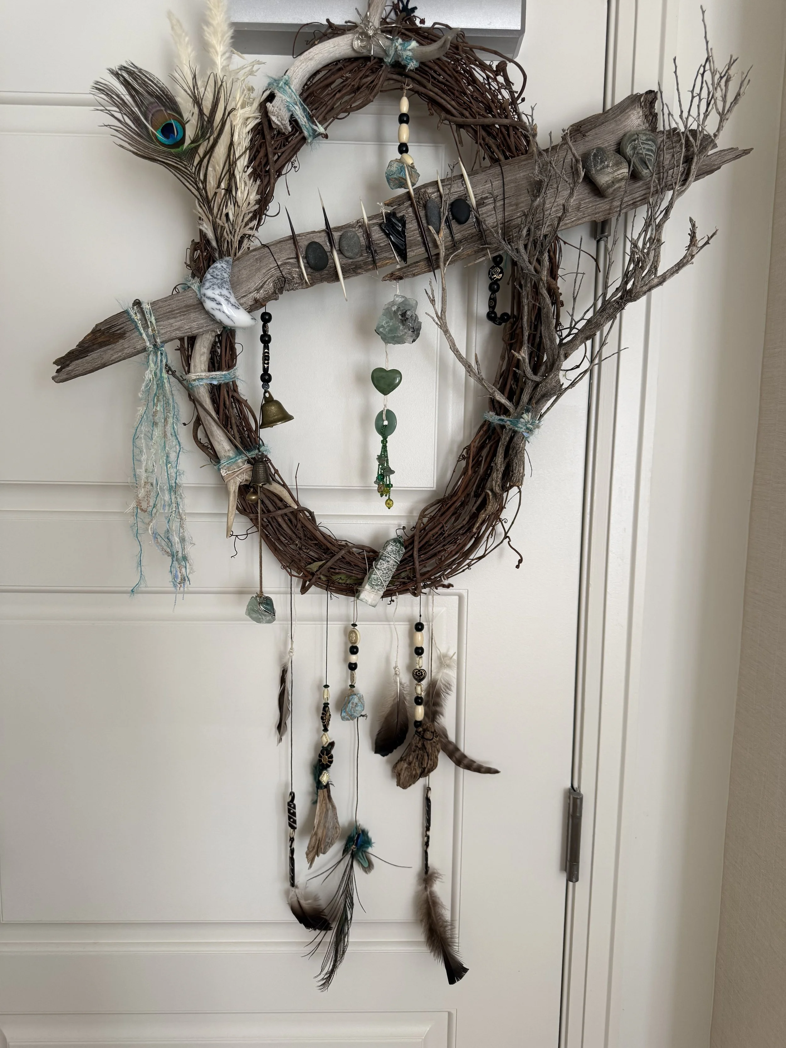 I work intuitively with crystals, driftwood, antler, feathers, ocean finds, and natural elements I’ve gathered on my travels. Each piece is chosen with care — matched to your intentions, your healing needs, and your unique energetic signature.
