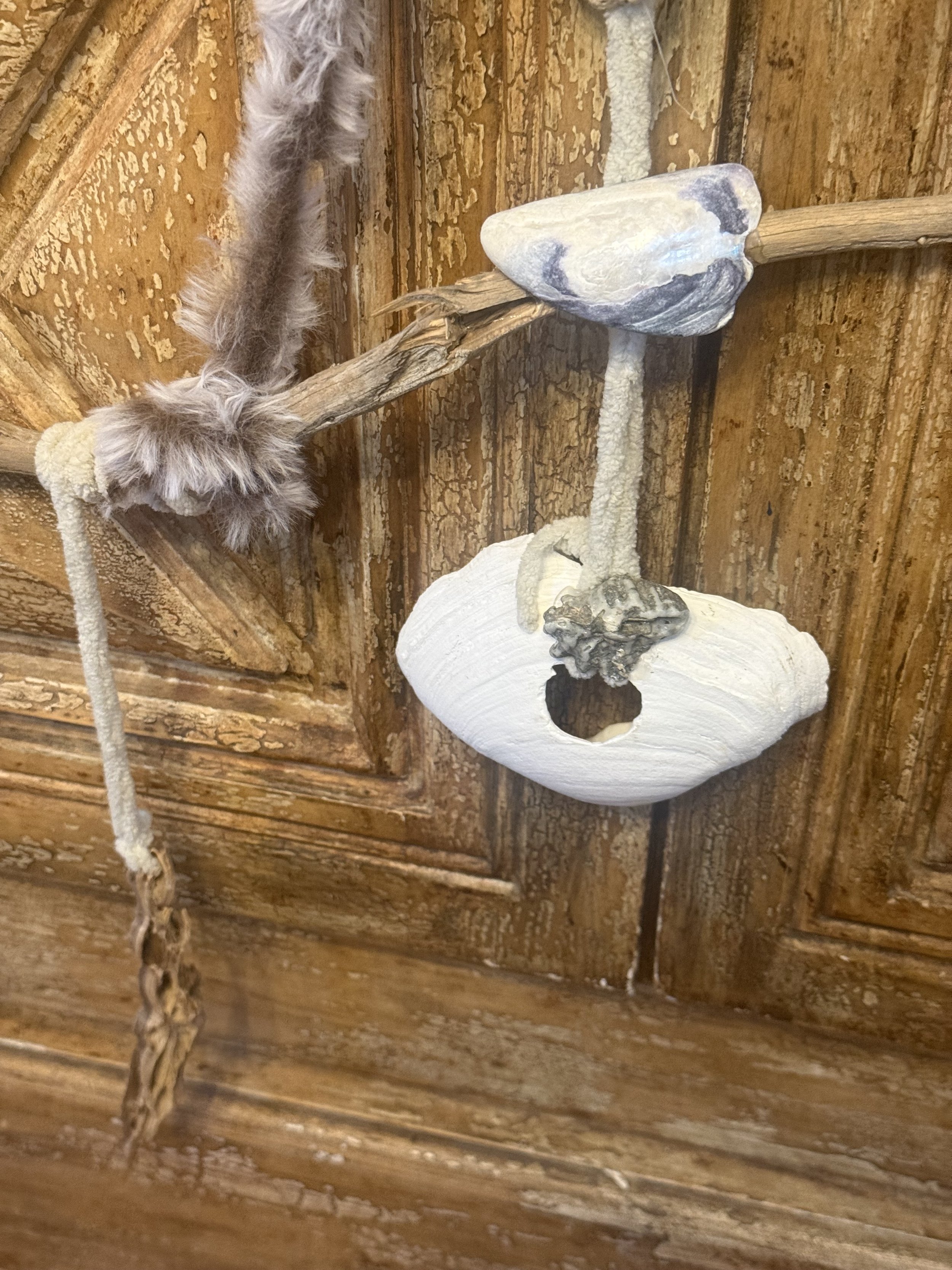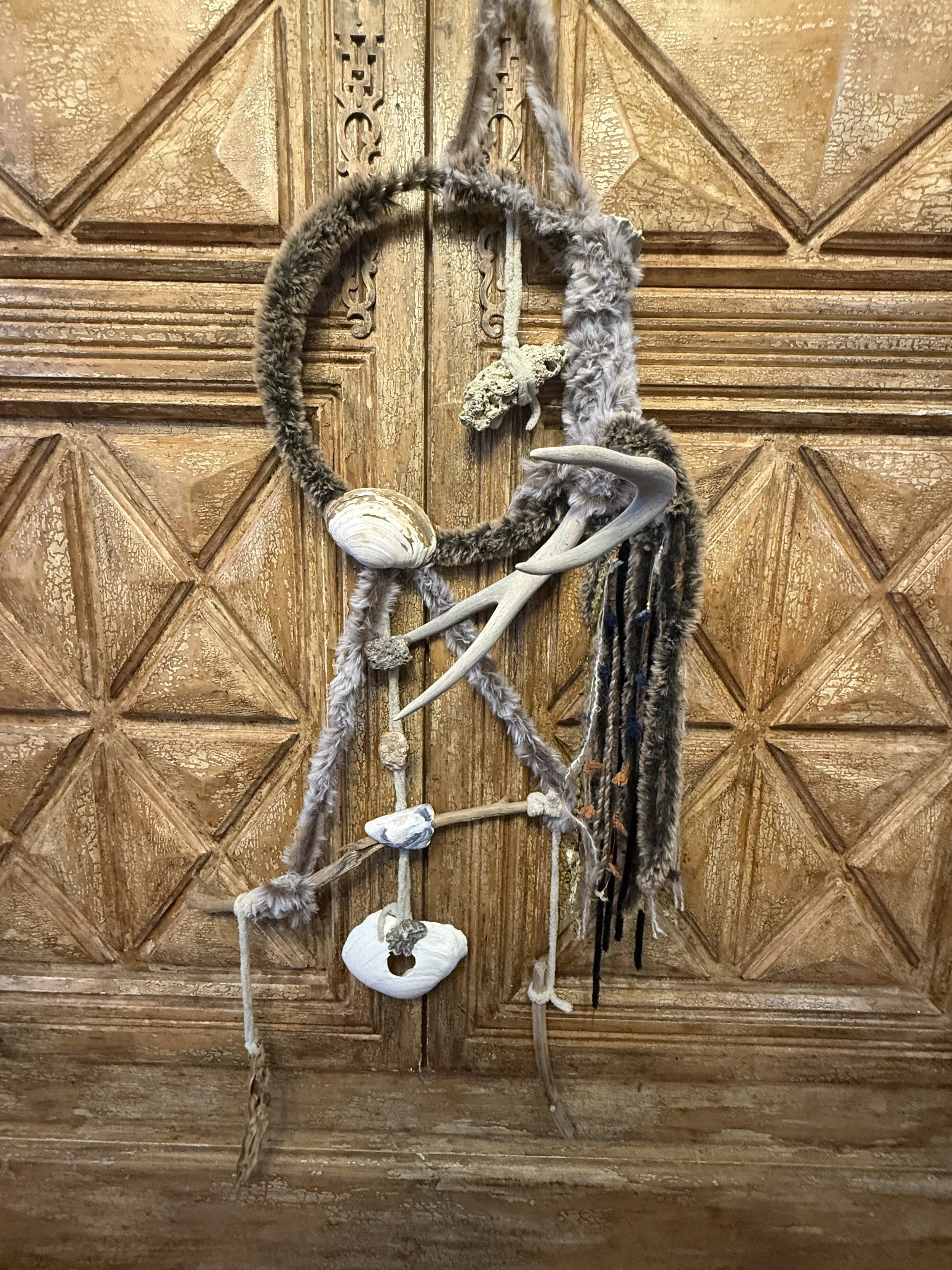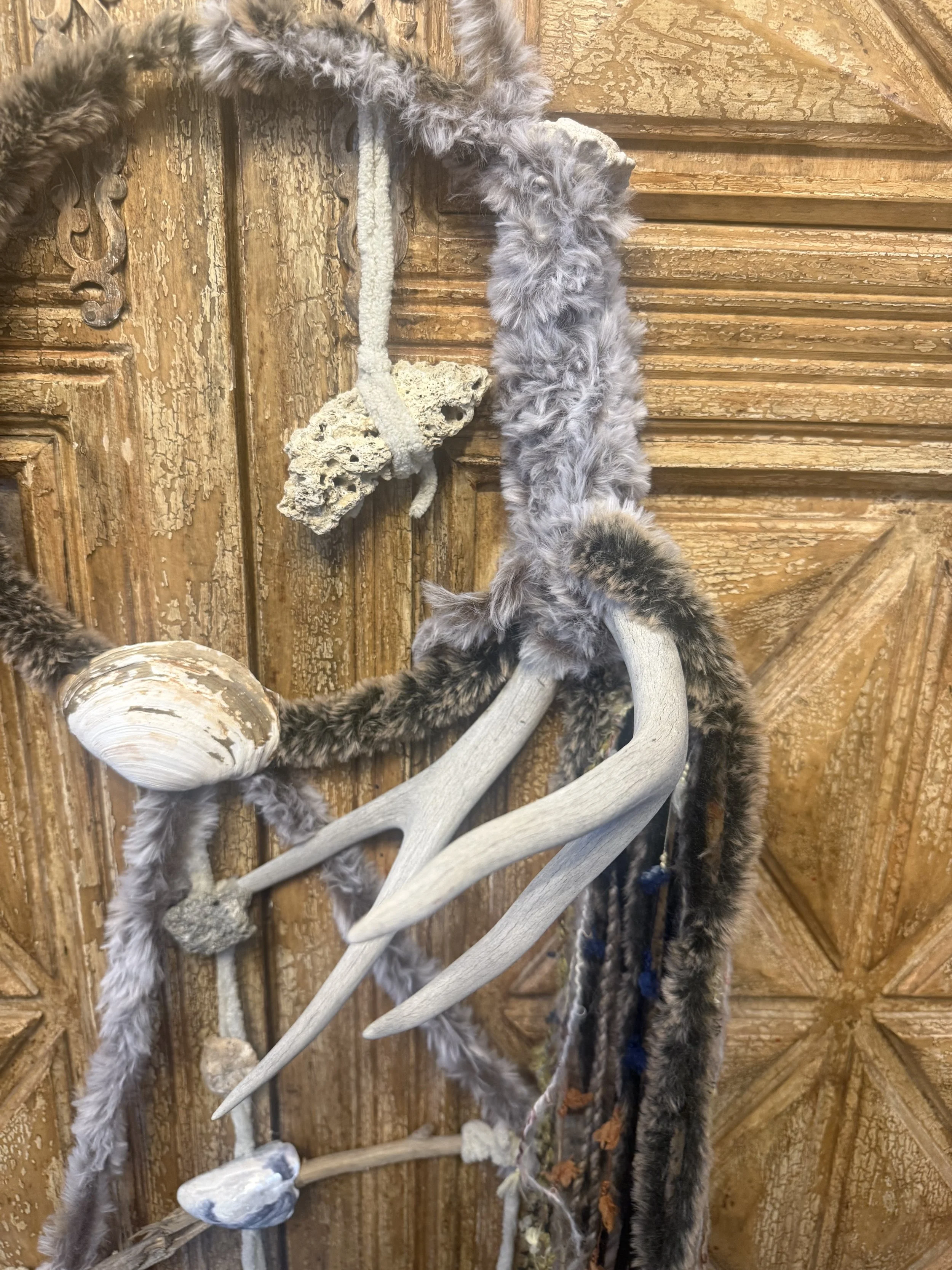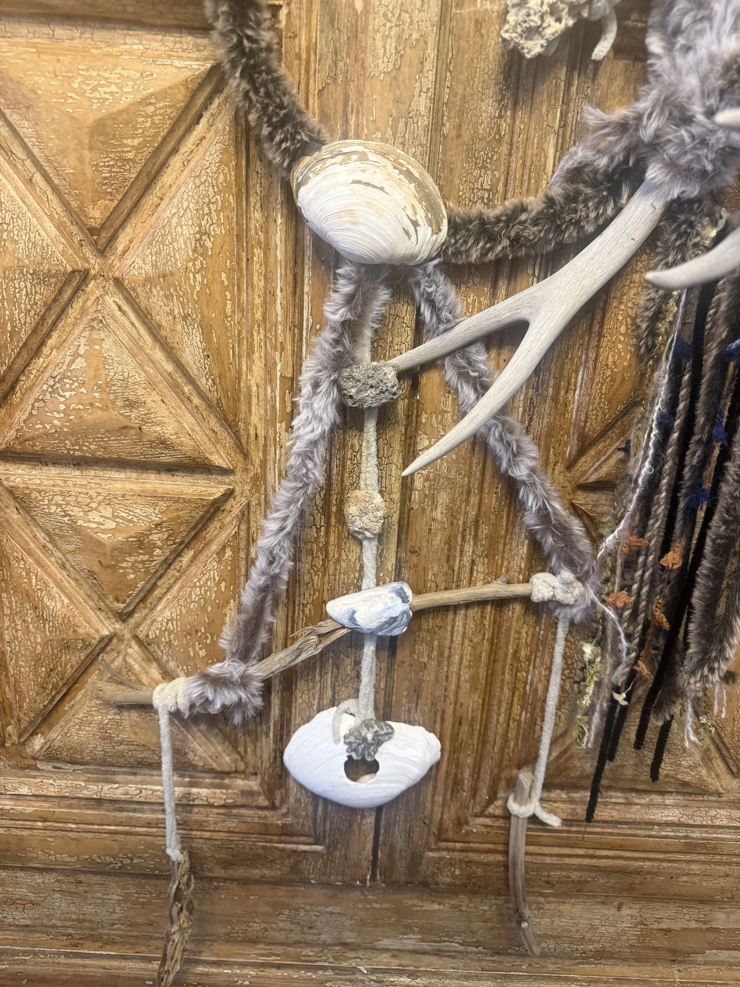 Earth, ocean, spirit. Antler, driftwood, shells and stones from the Oregon Coast woven into a one of a kind guardian piece. It feels like a sea guardian or forest altar piece. A grounding wall talisman
