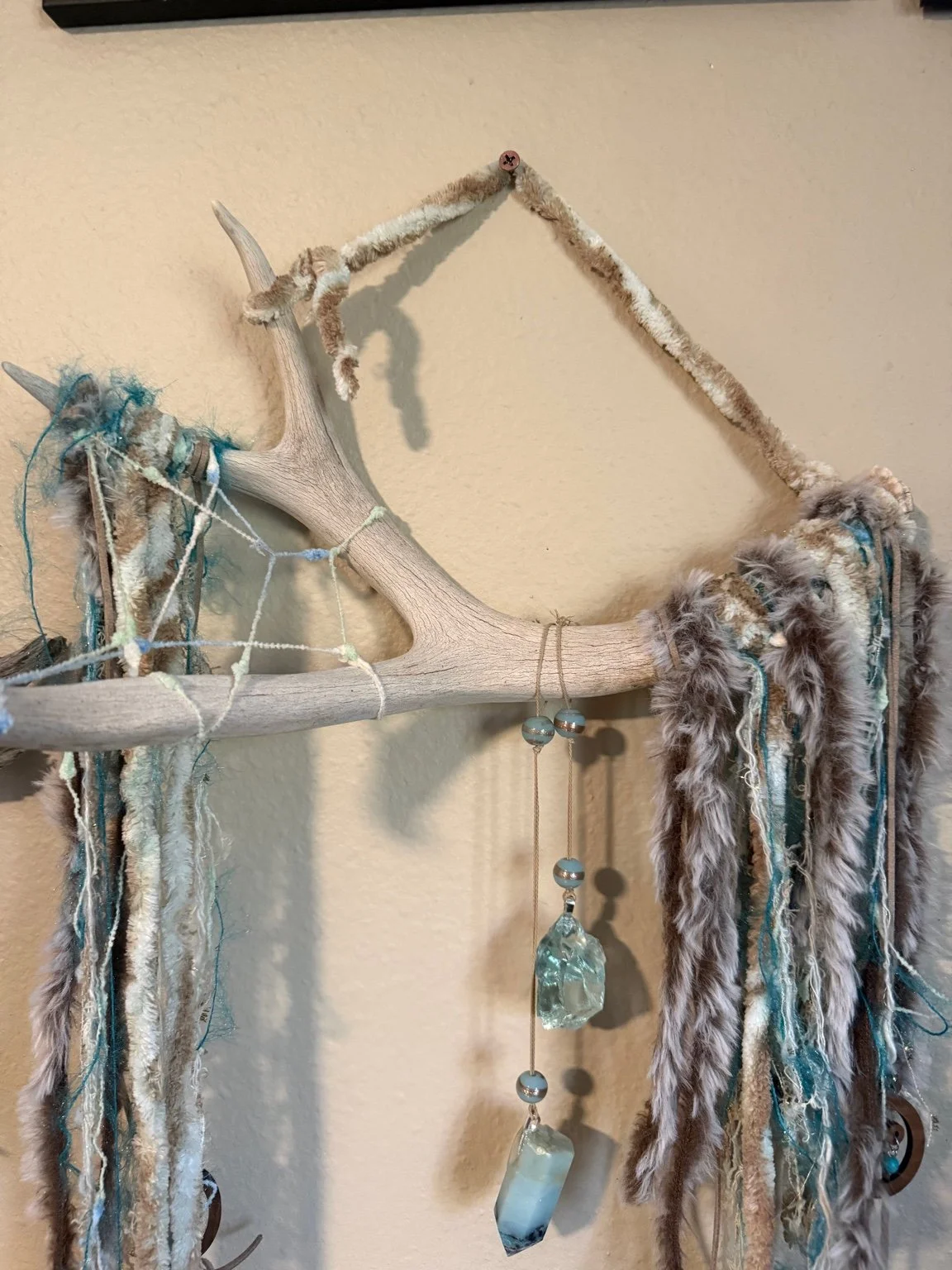 Materials: antler, faux-fur yarn, ocean-blue crystal, glass beads, brass bells, drift fibers.