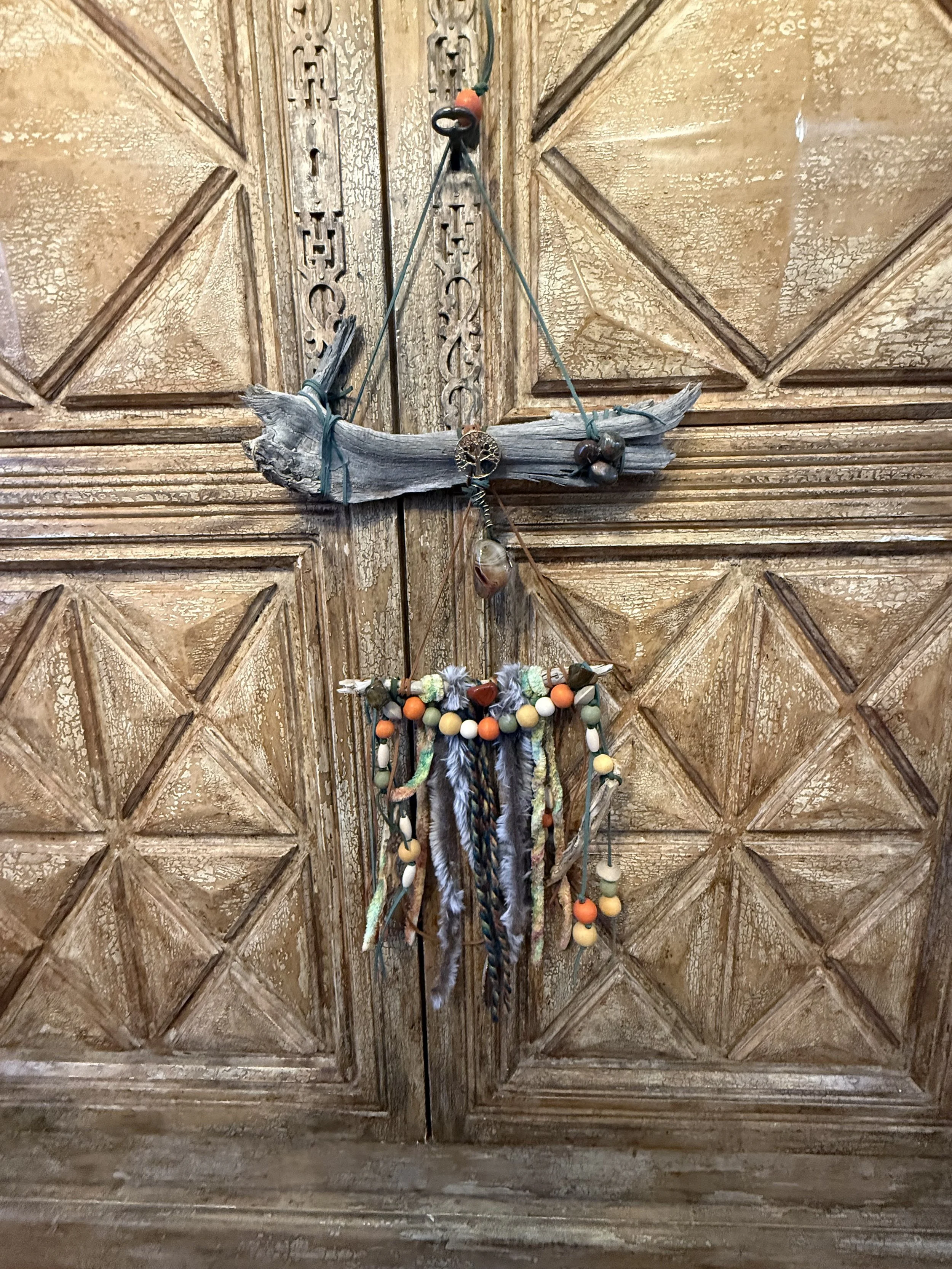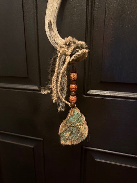 Earths breath, warm and grounded but alive with movement. The driftwood bar and antler Centerpiece make it feel ancestral, almost like a tribal wind chime or forest guardian. The textures, mossy greens, ochres, feathers and leather speak of roots, soil and old wisdom.
