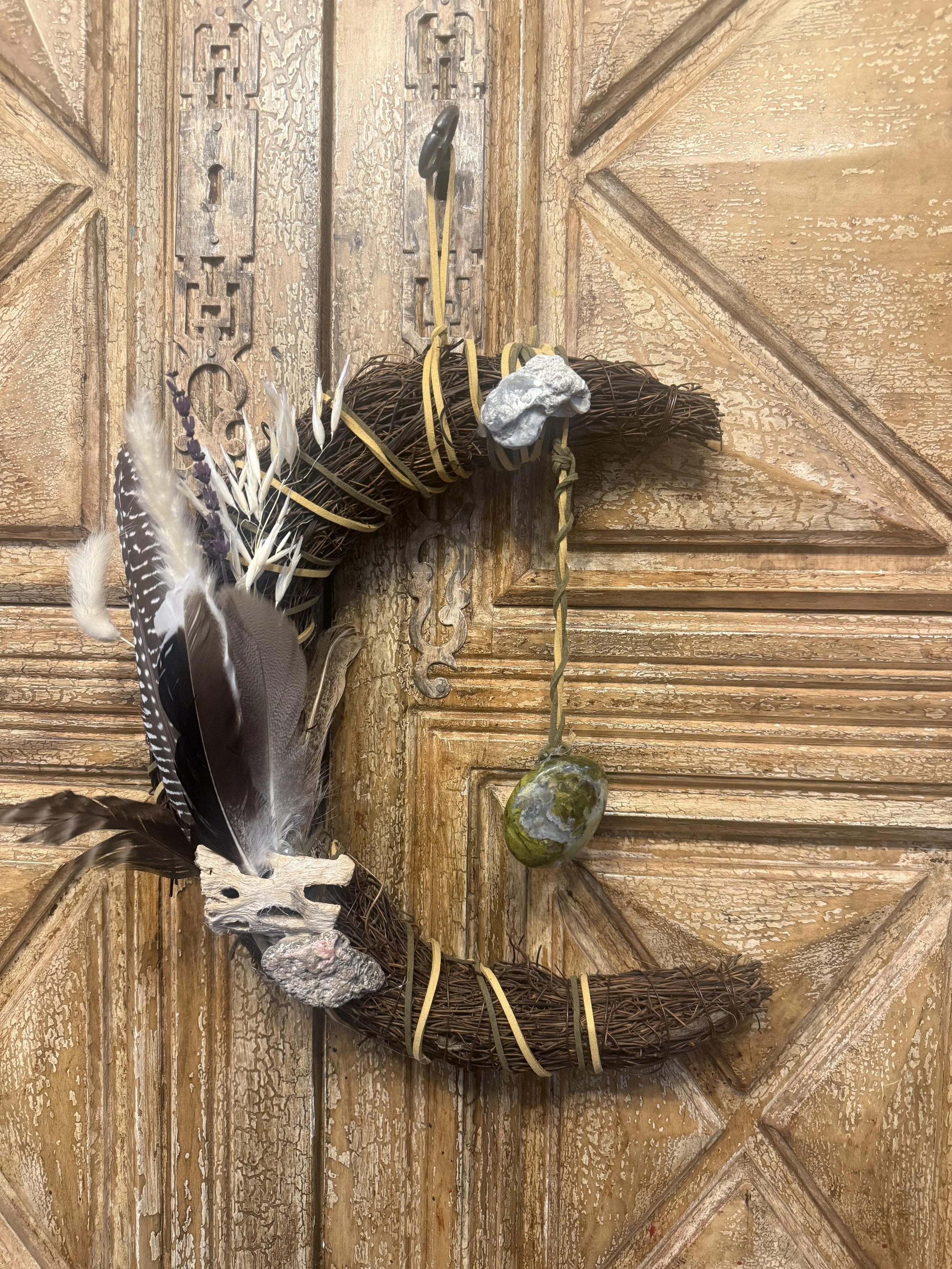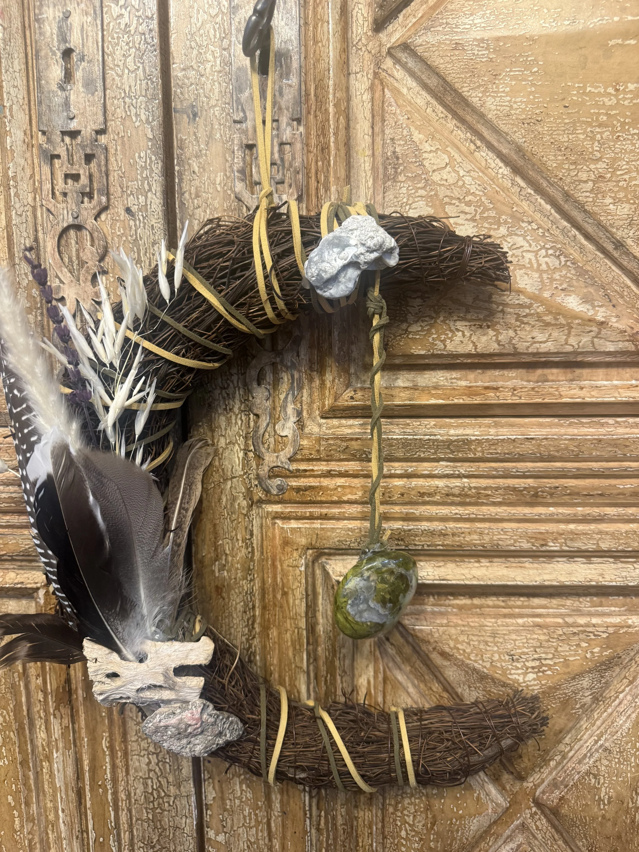 Crescent vine, driftwood, feather and stone, crafted for those who listen to the quiet of the moon. Guardian of cycles and intuition. Moon Keeper honors the rhythm between light and shadow, a talisman for those who move with the tides, not against them. Adorned by a moss agate
