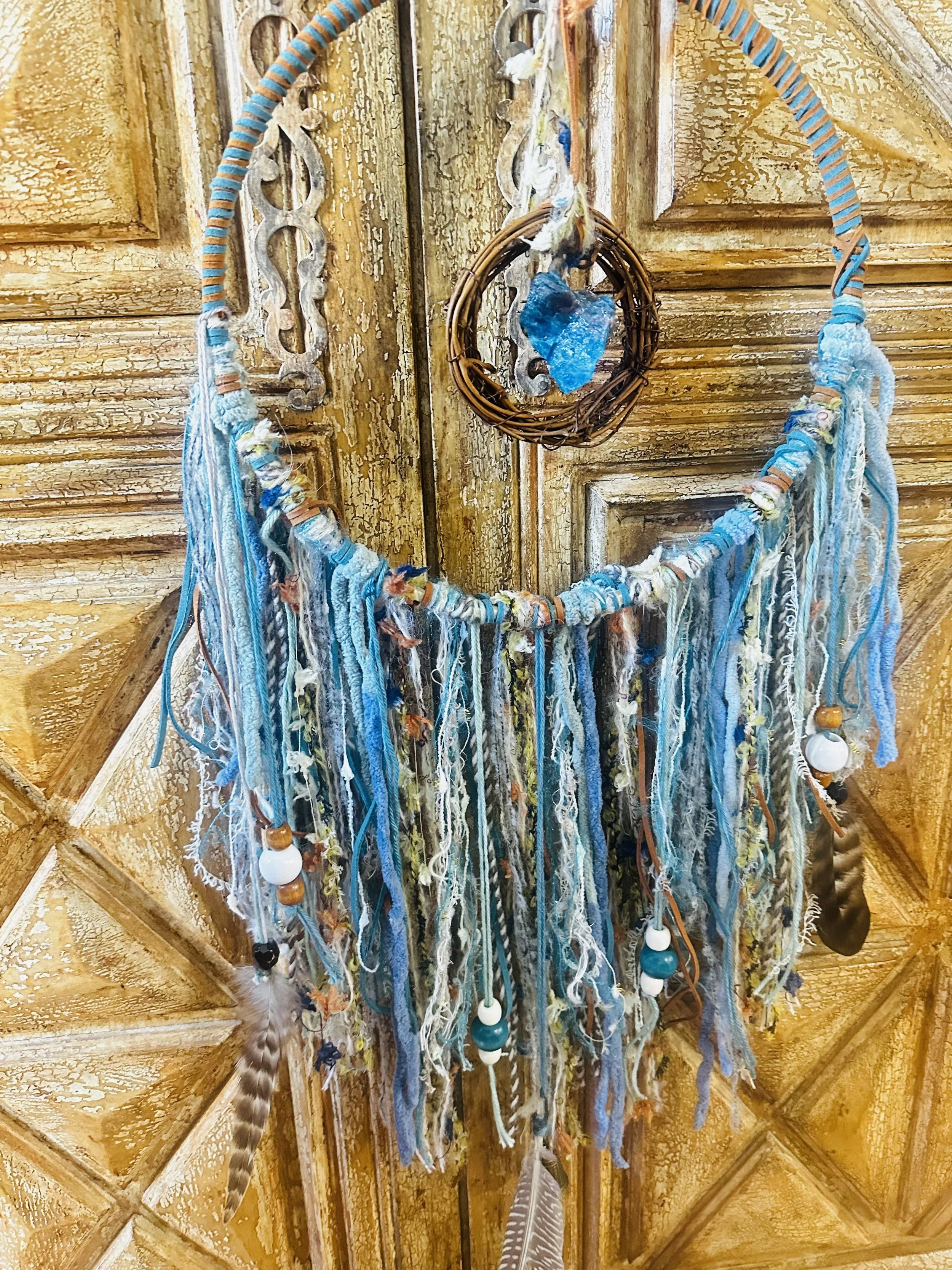 Soft, bright, and full of wonder, Joy Weaver carries the energy of the inner child — the part of you that still believes in magic, beauty, and possibility. Created from hand-gathered driftwood, pastel yarn, feathers, and a warm copper-wrapped agate, she’s equal parts sweetness and strength.